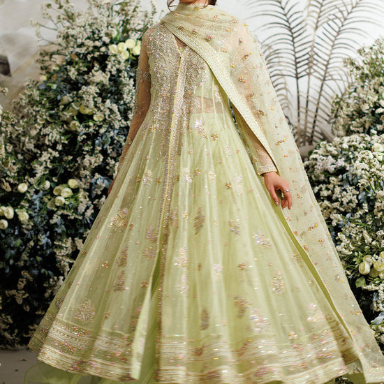 The sheer, kiwi green net kalidaar is layered over a shimmering strappy bustier, also heavily hand worked.