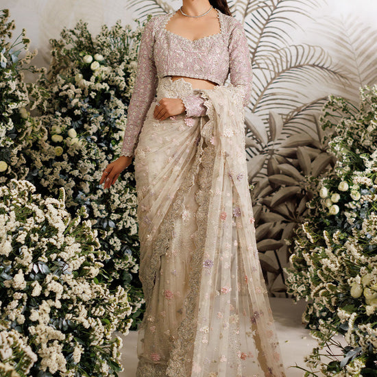 Paired with an impeccably tailored blouse cut from lavender zari silk. The blouse has an uber-flattering neckline with elegant full length sleeves.