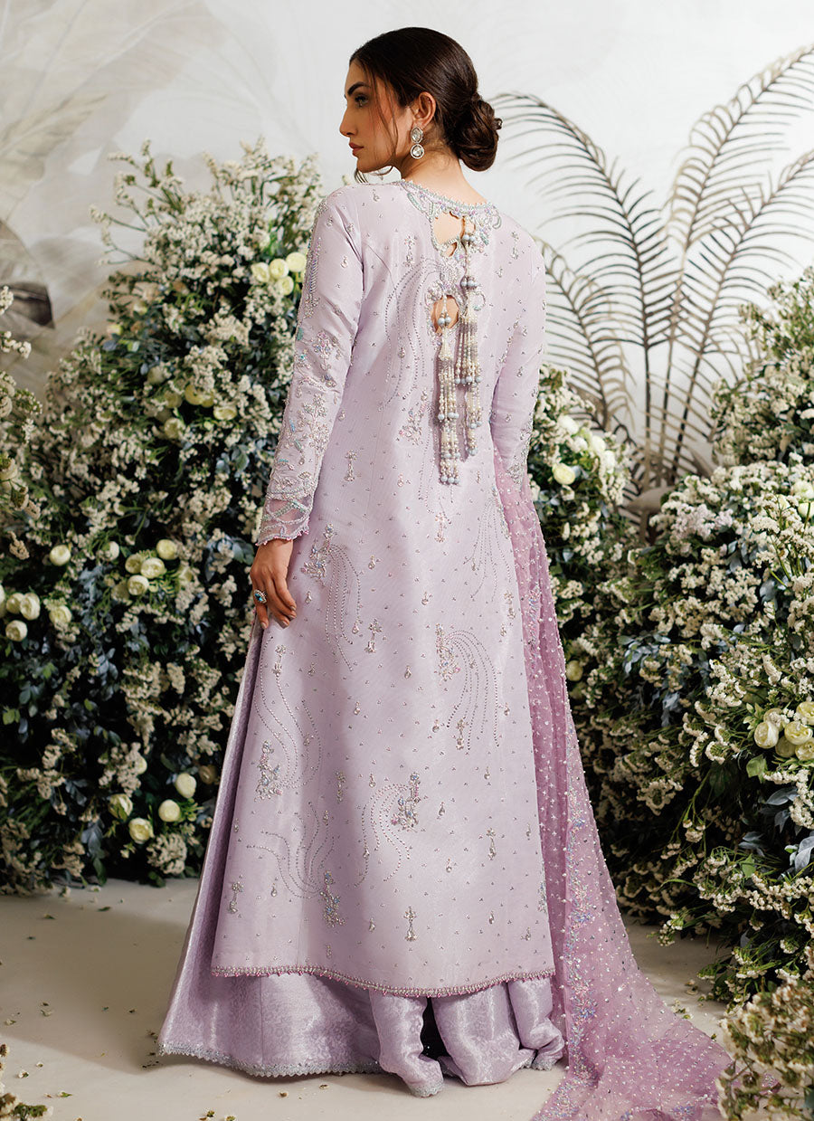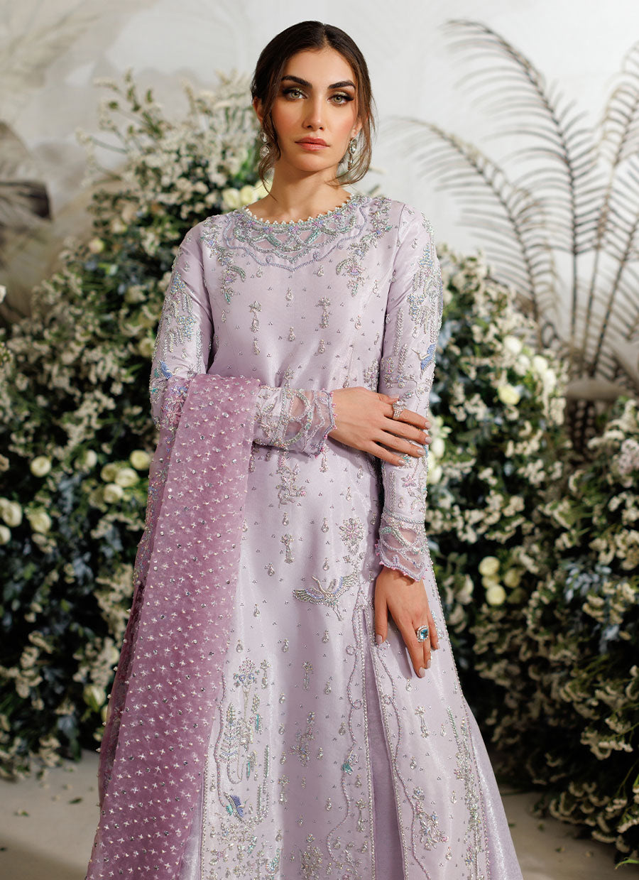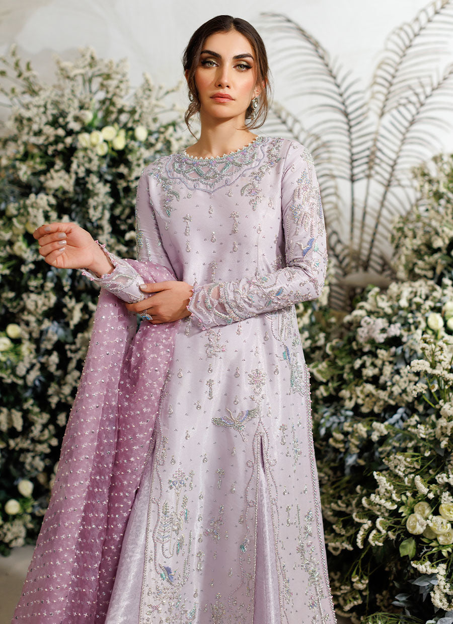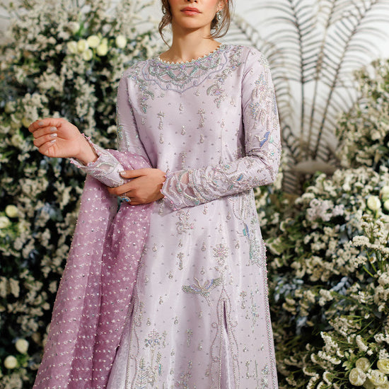 This zari silk kalidaar is in a delicate pale lilac hue which makes it an ideal choice for year around festivities. It has an absolutely gorgeous round neckline, embellished with intricate floral handwork of silver kora, dabka. Delicately hand embellished with sequins and Swarovski crystals to help you shine out amongst the crowd. Intricately hand worked floral motifs along the front of the shirt are designed to have heads turning everywhere.