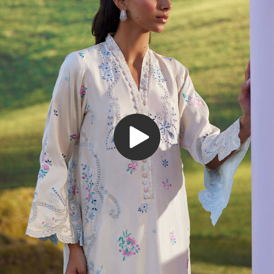 Understated and timeless, this powder blue ensemble is crafted in a lightweight fabric featuring delicate pastel embroidery scattered gracefully across the shirt. The relaxed silhouette is paired with a matching izaar for a clean, modern finish, while the soft dupatta adds effortless charm. An ideal choice for daytime events and serene festive moments.