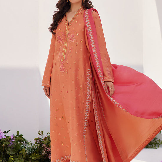 A fresh coral hue is richly embroidered with silk thread work in tonal salmon pink hues and while the universally flattering neckline is adorned with glimmering gold kaam daani. Delicate embroidered motifs add the perfect amount of glamour.