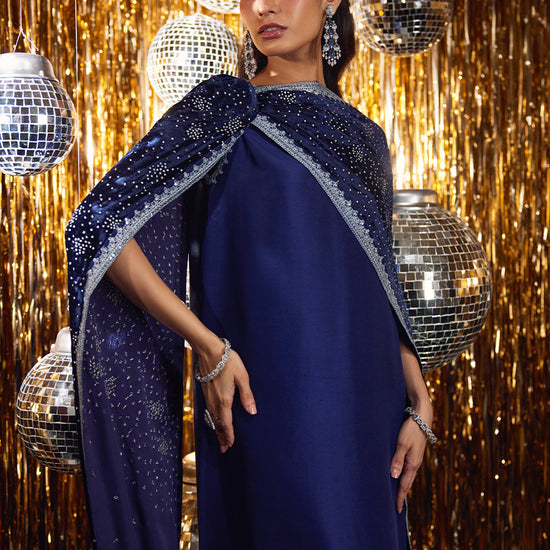 Inspired by celestial beauty, this deep navy kaftan-style dress captures the allure of the northern lights through exquisite silver crystal embellishments that shimmer with every movement. The fluid silhouette, cut from pure raw silk, exudes modern elegance while retaining a touch of old-world glamour.