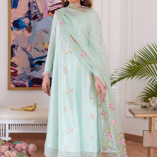 Elyssia Mint Embroidered Raw Silk Kalidar With Dupatta