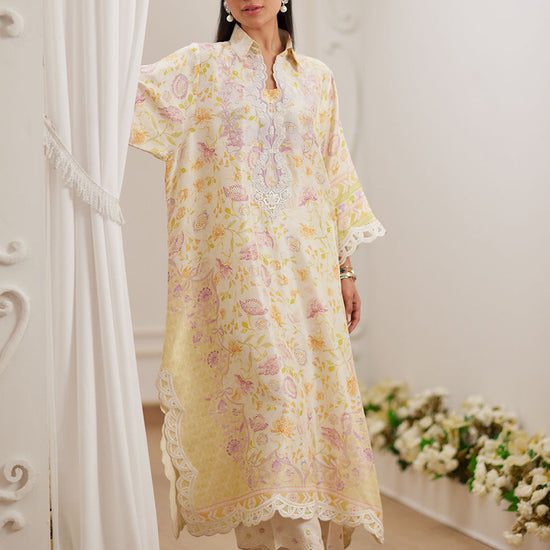 Irresistibly romantic florals, luxe fabrics and captivating details for the ultimate wardrobe reset!! Cut from sumptuous raw silk, the crisp ivory shirt dress is printed with whimsical florals in fun, fresh hues, designed to catch the eye over and over, making this an absolute must have. The relaxed, much loved silhouette has a universally flattering round neckline, while the sleeves adorned with ivory silk thread work, sequins and pearls makes this outfit feel like a dream. Pair yours with pure raw silk pants (as shown) to breeze through any and all festivities.
