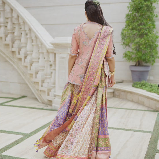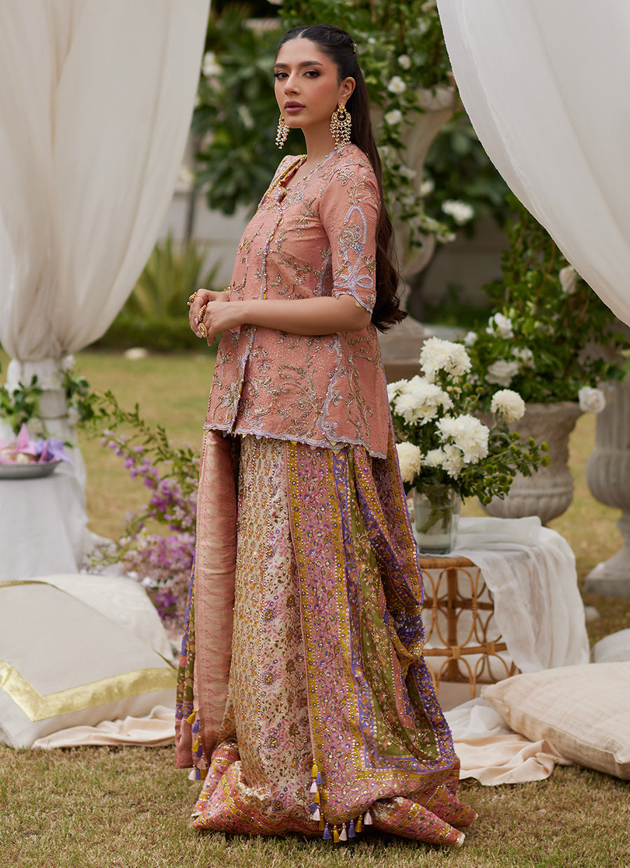 • Shirt: Salmon pink angrakha, embellished with kora, dabka, sitara, and appliqué work, finished with a hand-embellished pale lilac border.