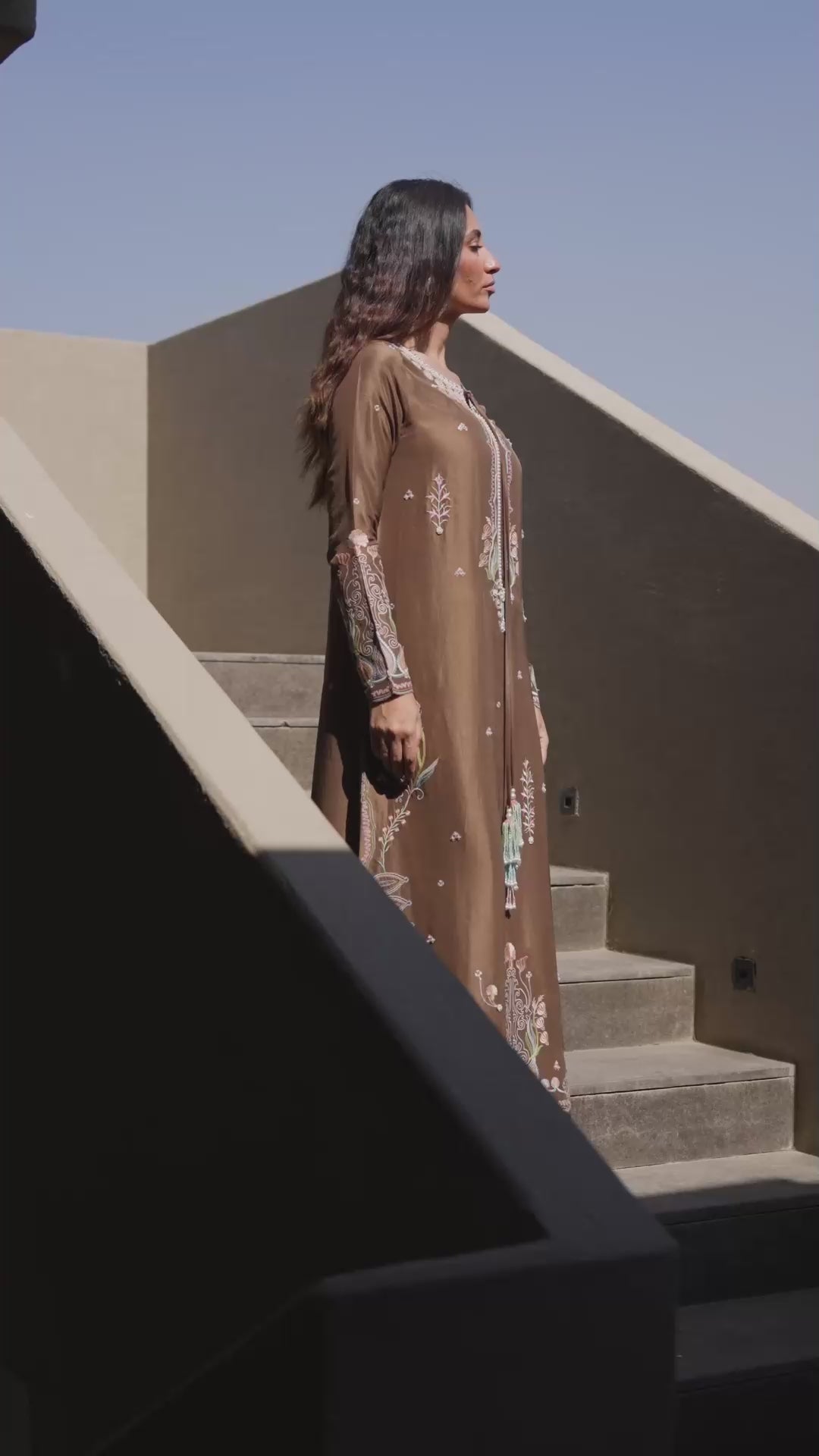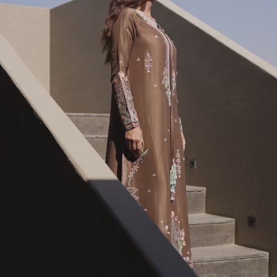 Cut from rich, coffee brown raw silk, this embroidered kaftan-style shirt embodies understated glamour. The neckline is delicately embellished with pearls, adding a touch of refined sparkle, while contrasting finishing details introduce a subtle contemporary edge. Soft botanical motifs in pastel tones sweep across the silhouette, creating a dreamy, effortlessly elegant look. Perfect for any festivity, this kaftan balances sophistication, charm, and modern refinement with graceful ease.