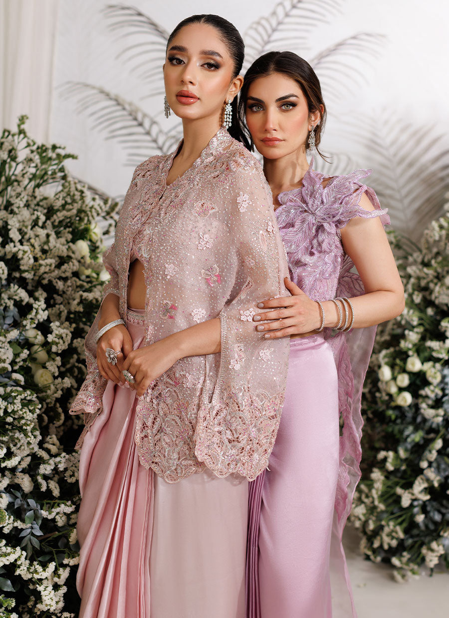 Flattering and feminine, a modern ethereal take on a tailored cape that's sure to make an instant style statement. This ensemble features a chai pink organza front open cape jacket that is adorned with shimmering hand embellishments, cut work, Swarovski crystals and 3D flower motifs. An uber flattering bodice that's also fully hand worked with delicate details adds that extra oopmh to this swoon-worthy ensemble. A chai pink, charmeuse pre-draped skirt, with excellent fall, completes the look.