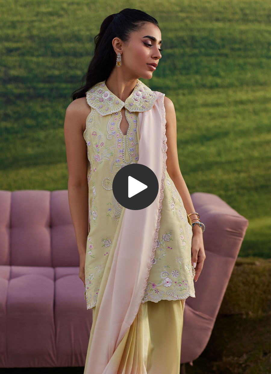 Bring effortless elegance to your festive wardrobe with Esma Sari a radiant ensemble in refreshing lemon yellow tones, perfect for Eid and intimate celebrations. The raw silk short shirt is beautifully adorned with delicate embroidered motifs and intricate hand-worked detailing, adding depth and artisanal charm to the look. Paired with a luxurious medium silk ombré sari, the drape transitions gracefully from sunny lemon into a soft blush pink, creating a refined yet vibrant contrast. A timeless statement for festive gatherings, Eid dinners, and special occasions.