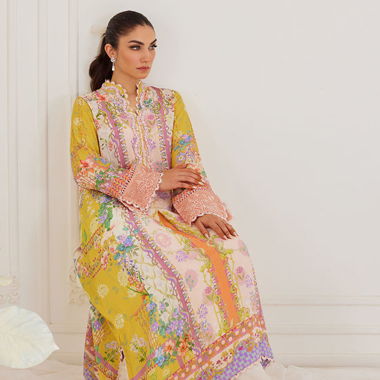 Cut from pure breathable crepe, the yellow and pink kaftan is printed with whimsical florals that bloom daintily all over, making this an absolute must have. The relaxed, much loved silhouette has a universally flattering neckline, adorned with delicate hand-made floral motifs, pearls and sequins making this outfit feel like a dream.