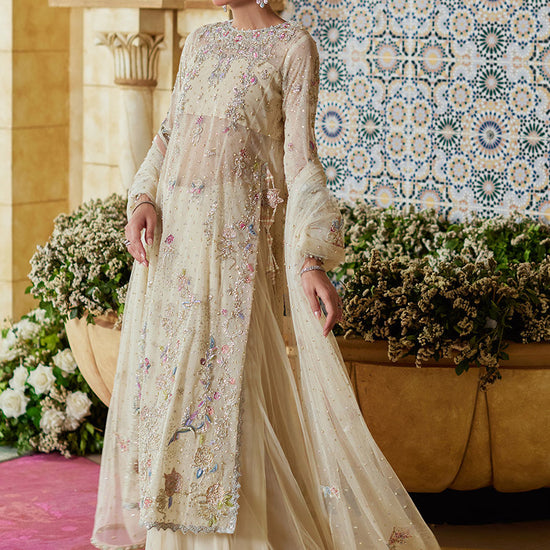 A dramatic flowing kalidaar cut from the softest ivory net, hand embellished with pearls, kora, dabka, resham thread work and Swarovski crystals. To further enhance the beauty of this shirt we have added a floral trellis delicately shimmering to wow everywhere you go.The tulle shirt is layered over a floor length lehenga in lusciously ivory tulle finished with a schiffli border, this undeniably glamorous ensemble is further elevated with tassels and an appliqué of floral intricate hand work with pearls, sequins, Swarovski crystals, kora and resham thread hand embroidery in pink, coral, purple, greens and blue. The dupatta on ivory net is hand embellished with pearl, sitara chan and resham work all over. One of the most loved outfits in our collection, a sure shot winner for years to come.
