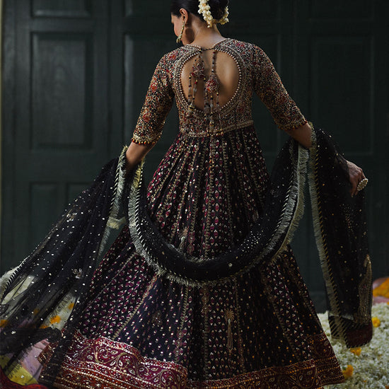 You can never not be the center of attention in this kalidaar. The exquisite ensemble features a hand blocked black and red kalidaar, meticulously adorned with sitara, kora, and dabka handwork, creating a mesmerizing blend of traditional embellishments. The kalidaar is elegantly paired with a raw silk lengha, adding richness and complementing the intricate detailing of the top. The look is complete with a striking black net dupatta embellished with sitara chann all over, imparting a subtle yet radiant shimmer. The dupatta is further adorned with hand worked zari motifs, enhancing its elegance and traditional allure. A golden kiran all around the dupatta adds a touch of luxury and completes the ensemble with finesse. This ensemble is a perfect fusion of classic craftsmanship and contemporary elegance, ideal for making a statement at weddings and festive celebrations. The intricate detailing and harmonious color combination make it a standout choice for those seeking a sophisticated and timeless look.