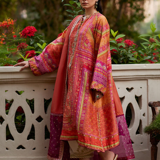 This ensemble has a canvas of vibrant tangerine and hot pink, artfully illustrated with a myriad of hues and pristine details. Adorned with delicate embroidery on the neckline, sleeves and daaman this kurta is a sure shot show stopper.