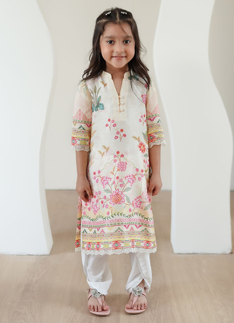 Rendered in pure raw silk and adorned with delicate floral motifs, this straight kurta and shalwar set for young girls captures the essence of youthful grace. Set against a romantic canvas of pale pink, the ensemble radiates warmth and light, evoking a sense of joy and serenity. The kurta features soft pleating that adds gentle movement and a touch of sophistication, while its airy, sleeveless cut ensures comfort and ease. Paired with a matching shalwar, the look is a harmonious blend of classic tradition and contemporary charm. With its subtle sheen and elegant detailing, this set is a timeless choice for festive occasions, perfect for the young girl who delights in understated beauty.