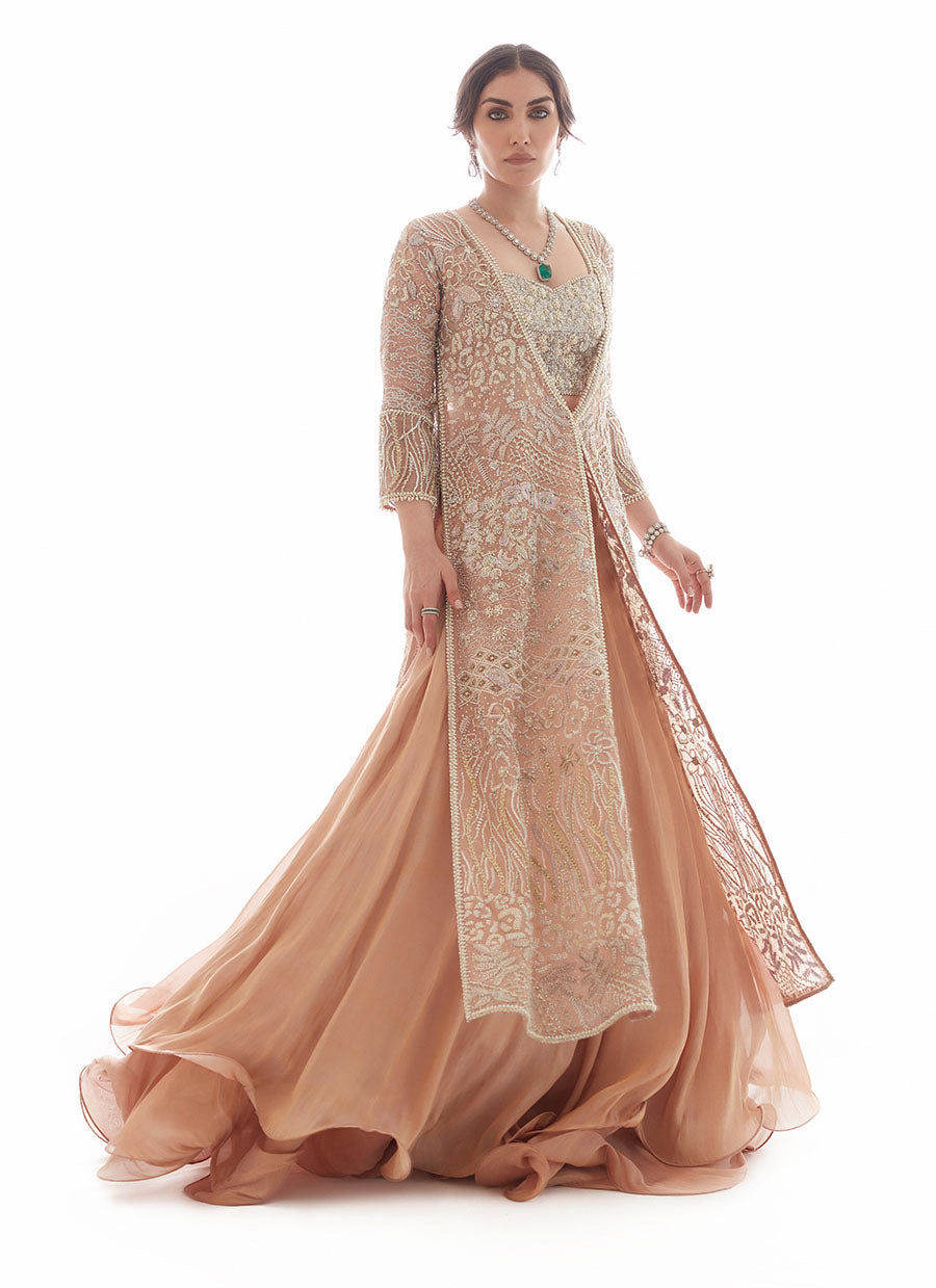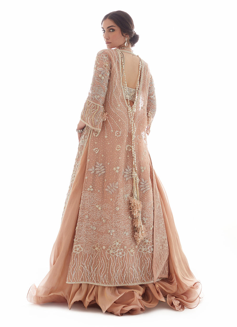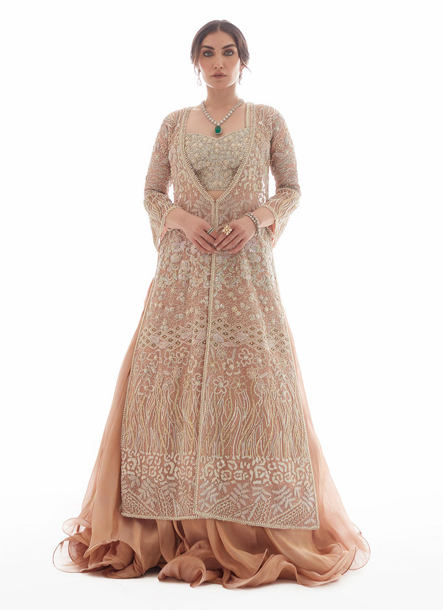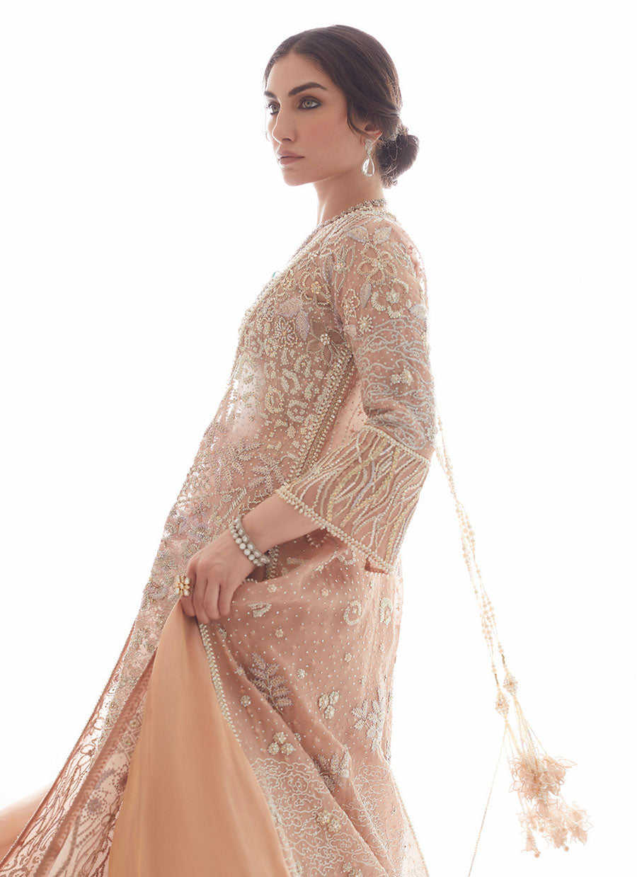 The intricate embellishments, delicate fabrics, and stunning design make this ensemble a true work of art. Introducing our exquisite ensemble, featuring a chai Pink organza Jacket paired with a Three Tier Tissue Skirt. The jacket is designed with a front and sides open style, showcasing a modern and stylish silhouette. The elbow-length sleeves with cuffs add a touch of elegance and sophistication to the overall look. The jacket is crafted from delicate chai pink organza, creating a soft and ethereal appearance. It is heavily embellished with sequins, kamdani work, naqeshi, and Swarovski crystals, adding a stunning sparkle and luxurious touch to the ensemble.
