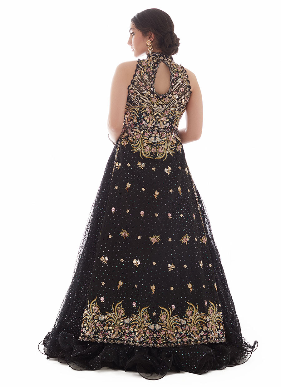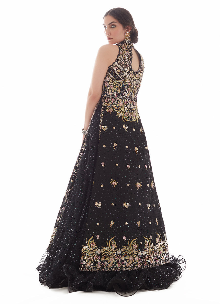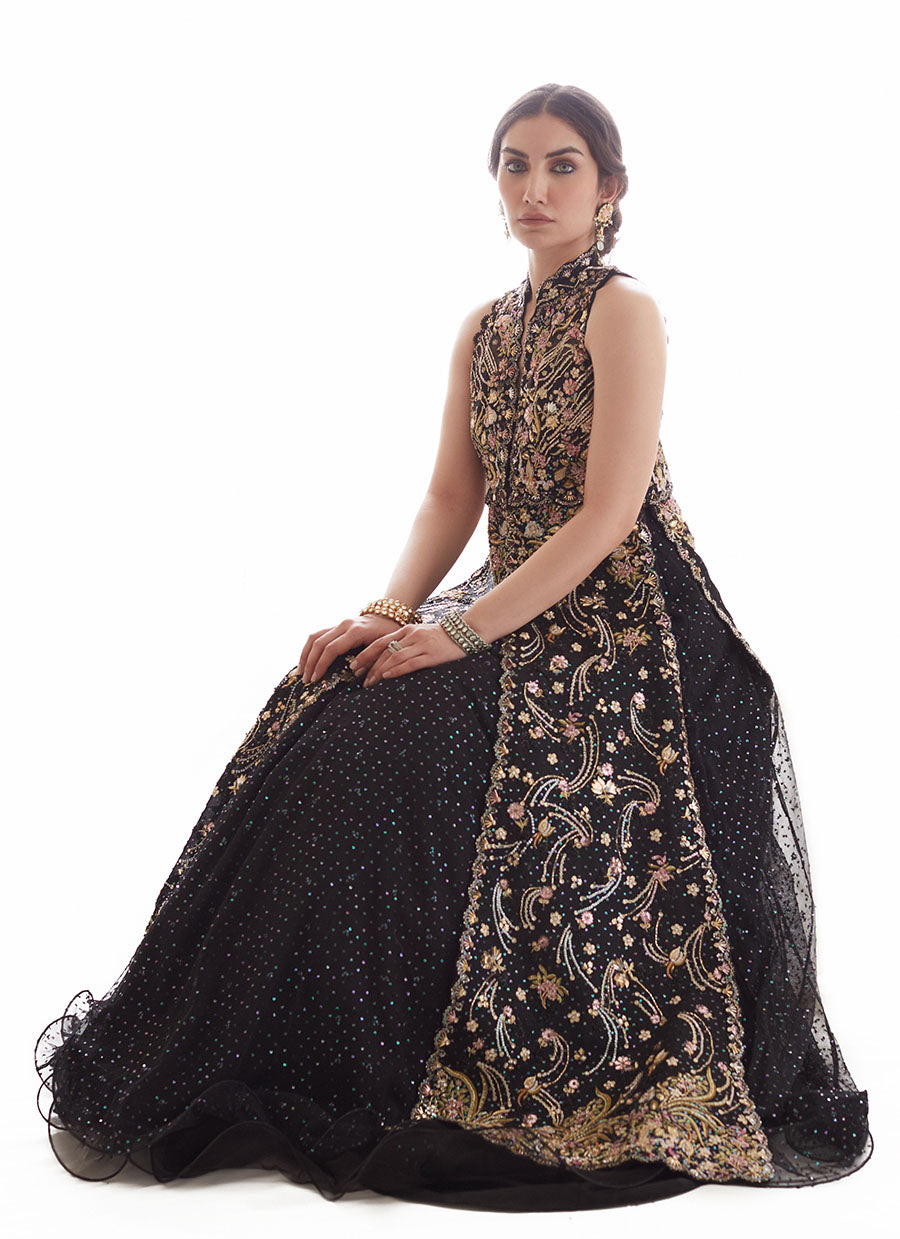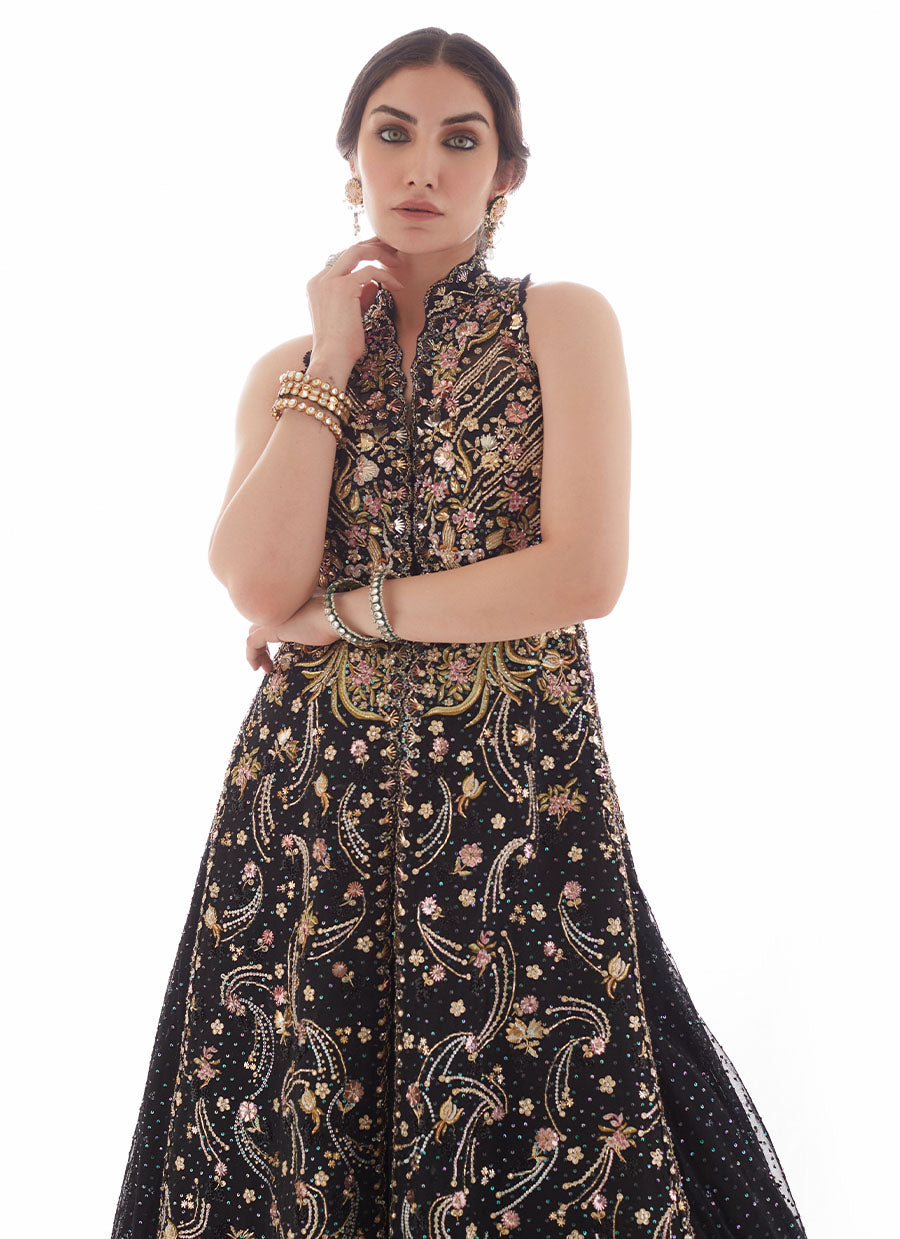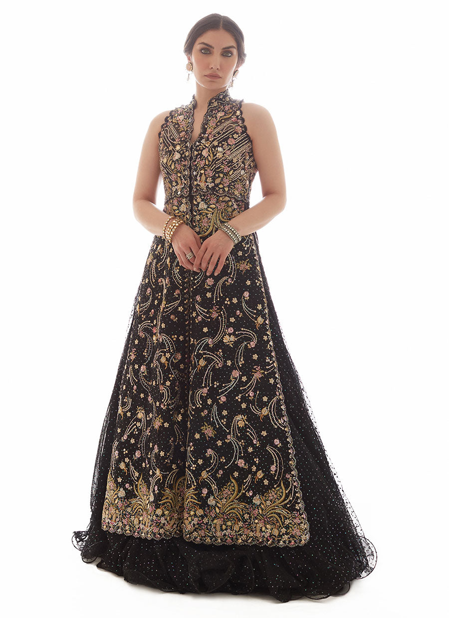 Introducing our elegant ensemble, featuring a black organza sleeveless Jacket paired with a Three Tier Net Skirt. The sleeveless jacket is designed with a front and sides open style, creating a contemporary and sophisticated silhouette. It features a collar that adds a touch of elegance and structure to the overall look. The black organza jacket exudes timeless charm and is adorned with intricate embellishments. The sequins, kamdani work, multi-color thread work, naqeshi, and Swarovski crystals create a mesmerizing and luxurious design that catches the light and dazzles with every movement. The three-tier net skirt complements the jacket perfectly, adding a sense of grace and femininity to the ensemble. The layers of flowing net fabric create a beautiful and ethereal look that is sure to turn heads.