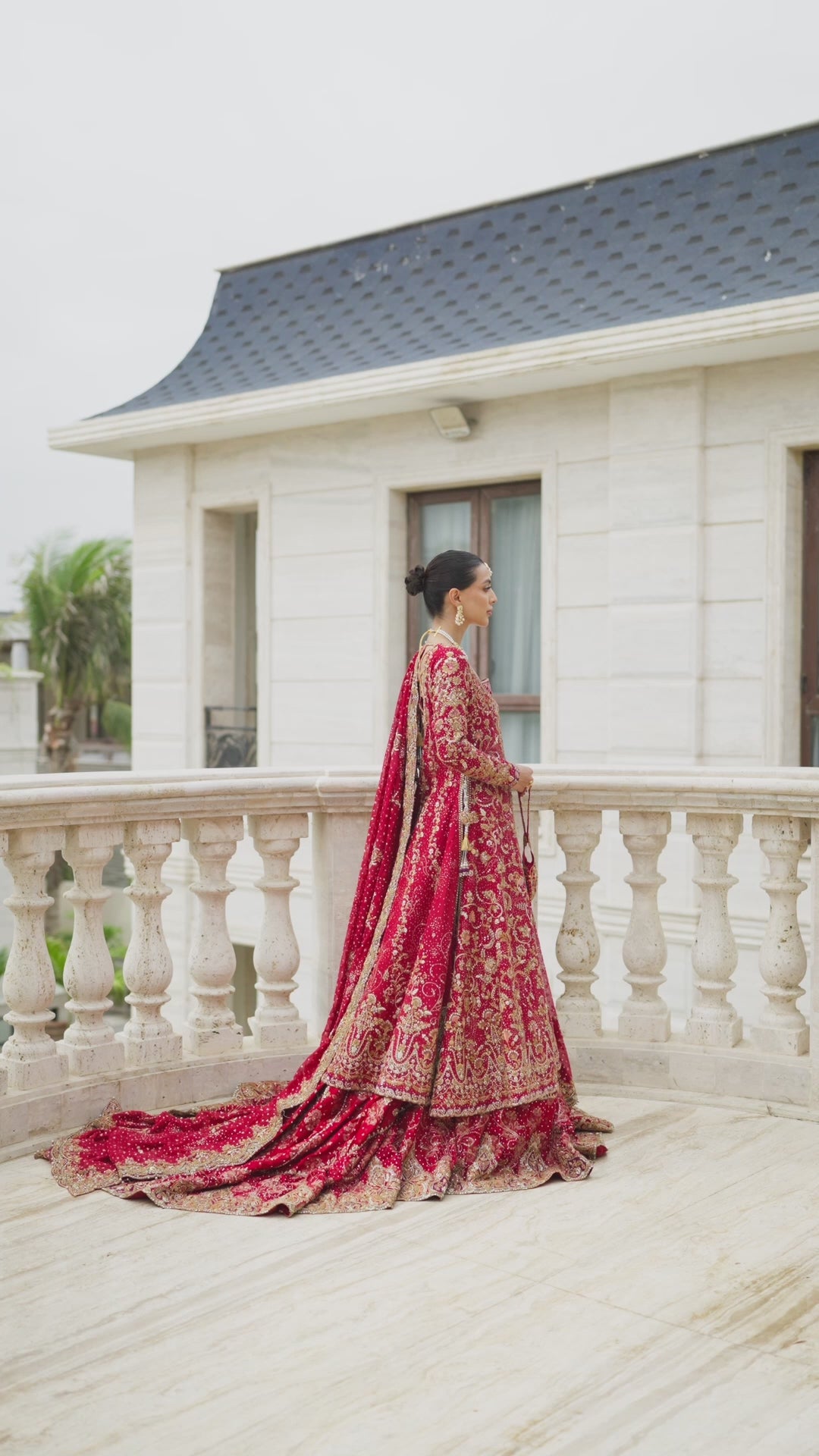 - Keep hair in a sleek bun to balance the volume, finished with a dupatta draped dramatically over the head and trailing at the back.