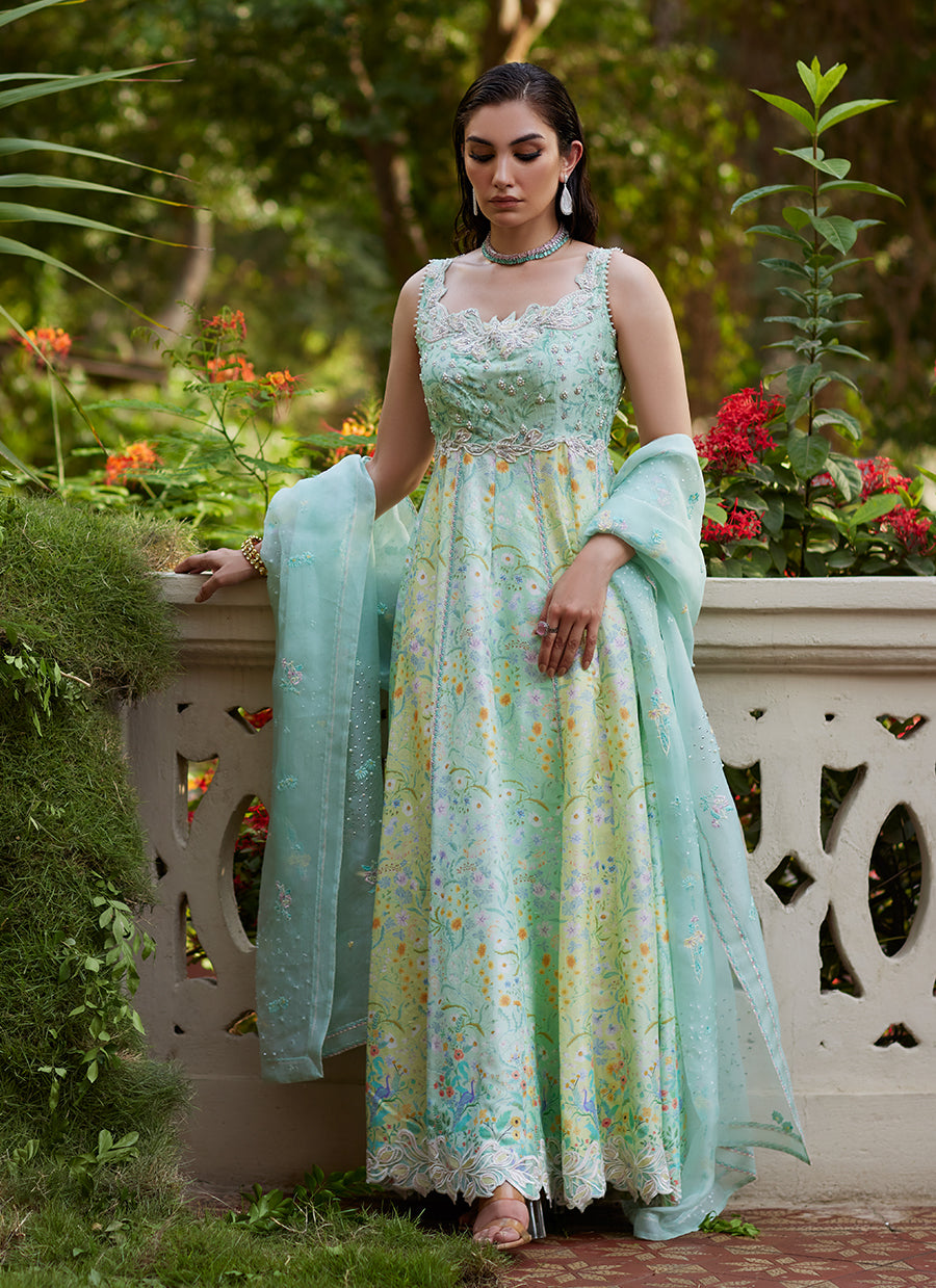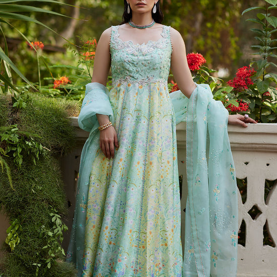The organza dupatta, decorated with silk thread work in soothing pastel hues and silver sequin bursts adds a touch of graceful flair.