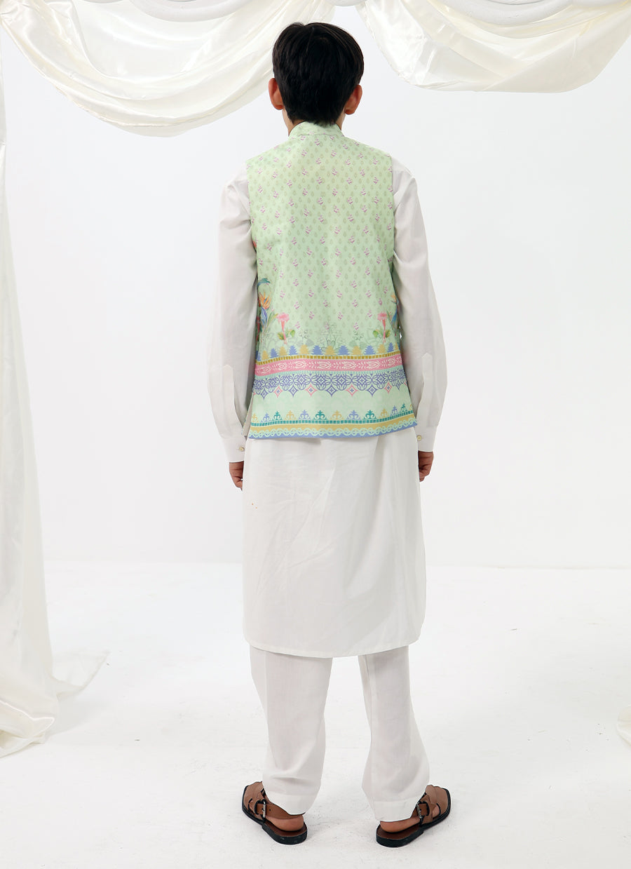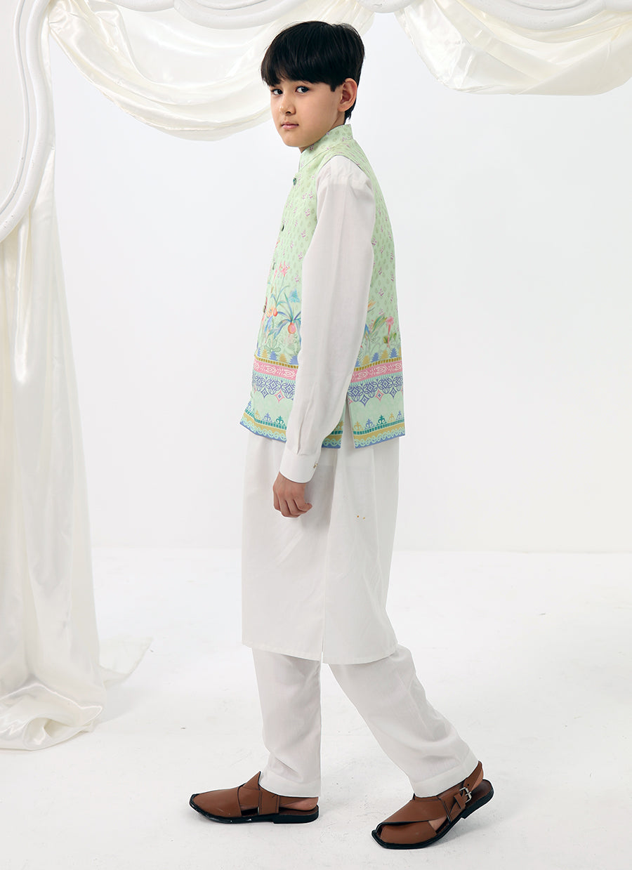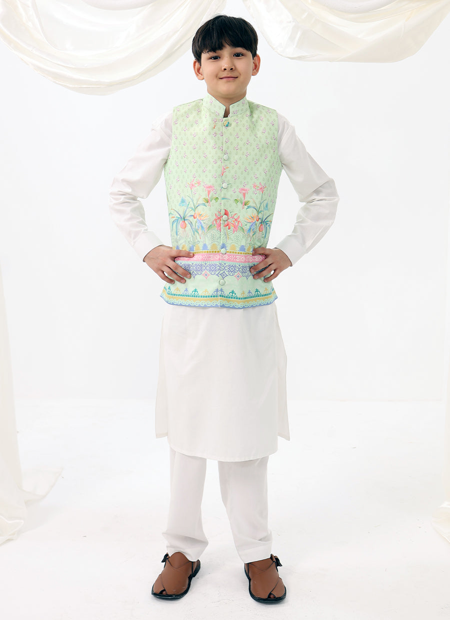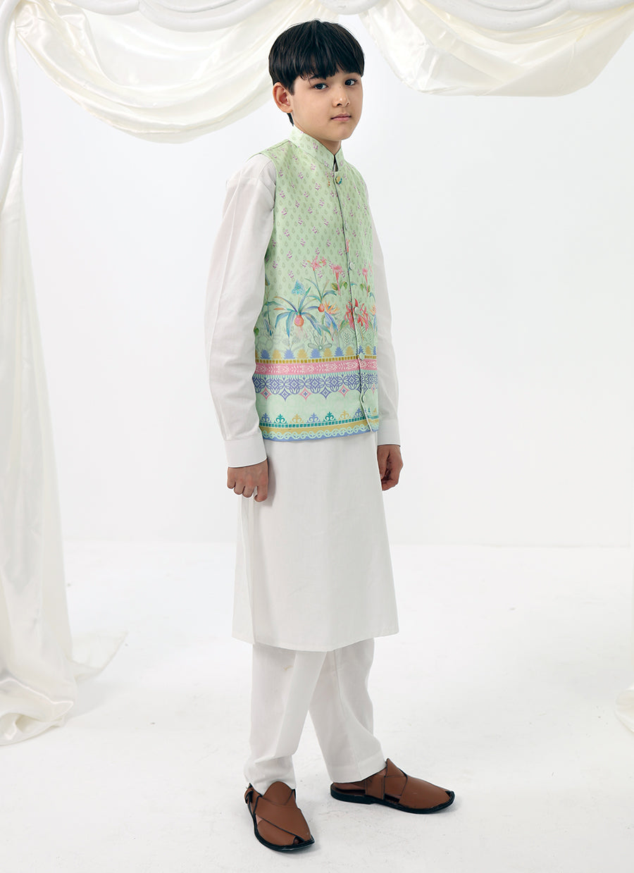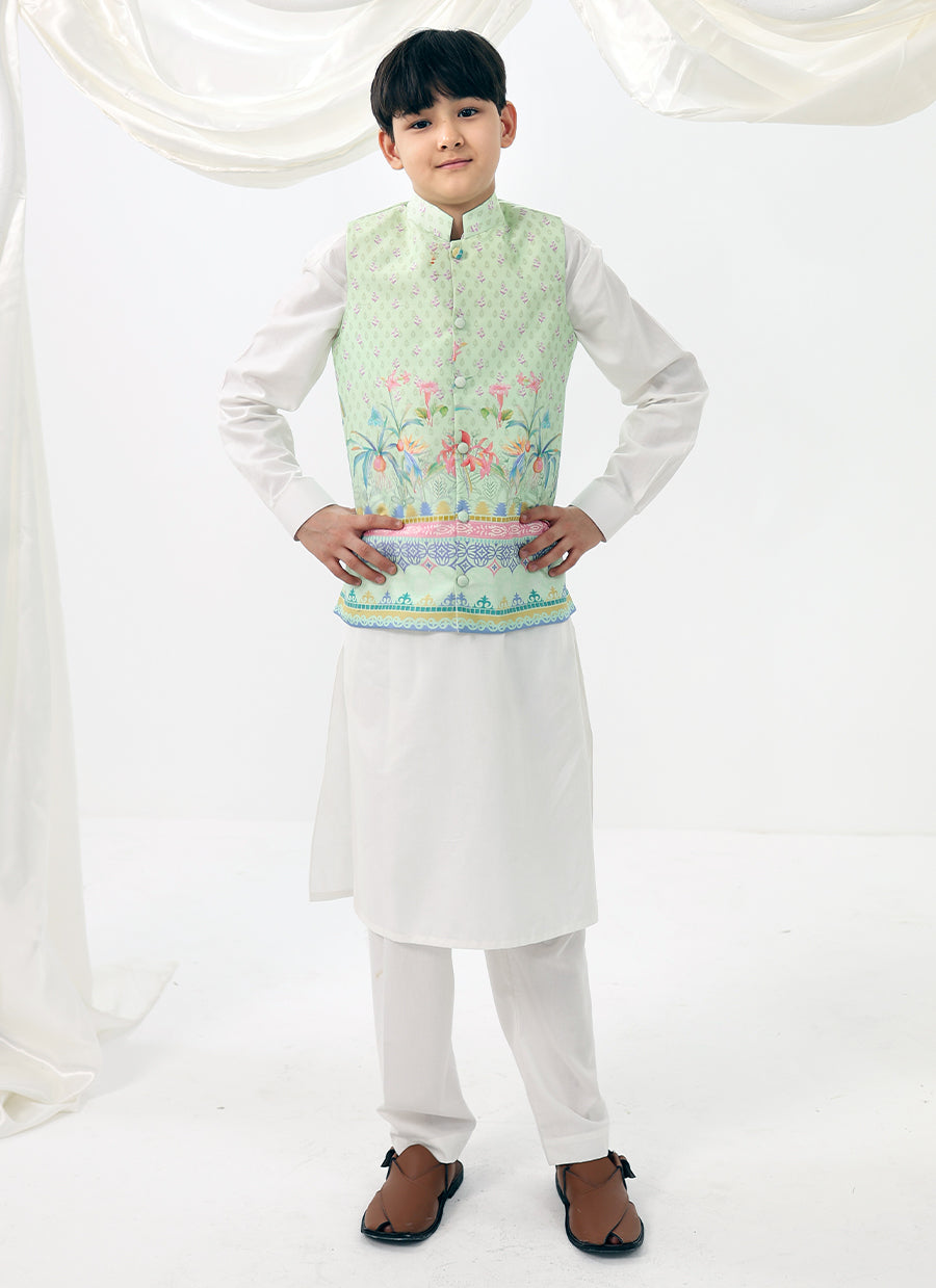 Ilan Mini is a charming festive ensemble designed for effortless style and comfort. A classic white kurta shalwar is paired with a softly printed pastel waistcoat, bringing a playful yet polished touch to traditional kidswear.