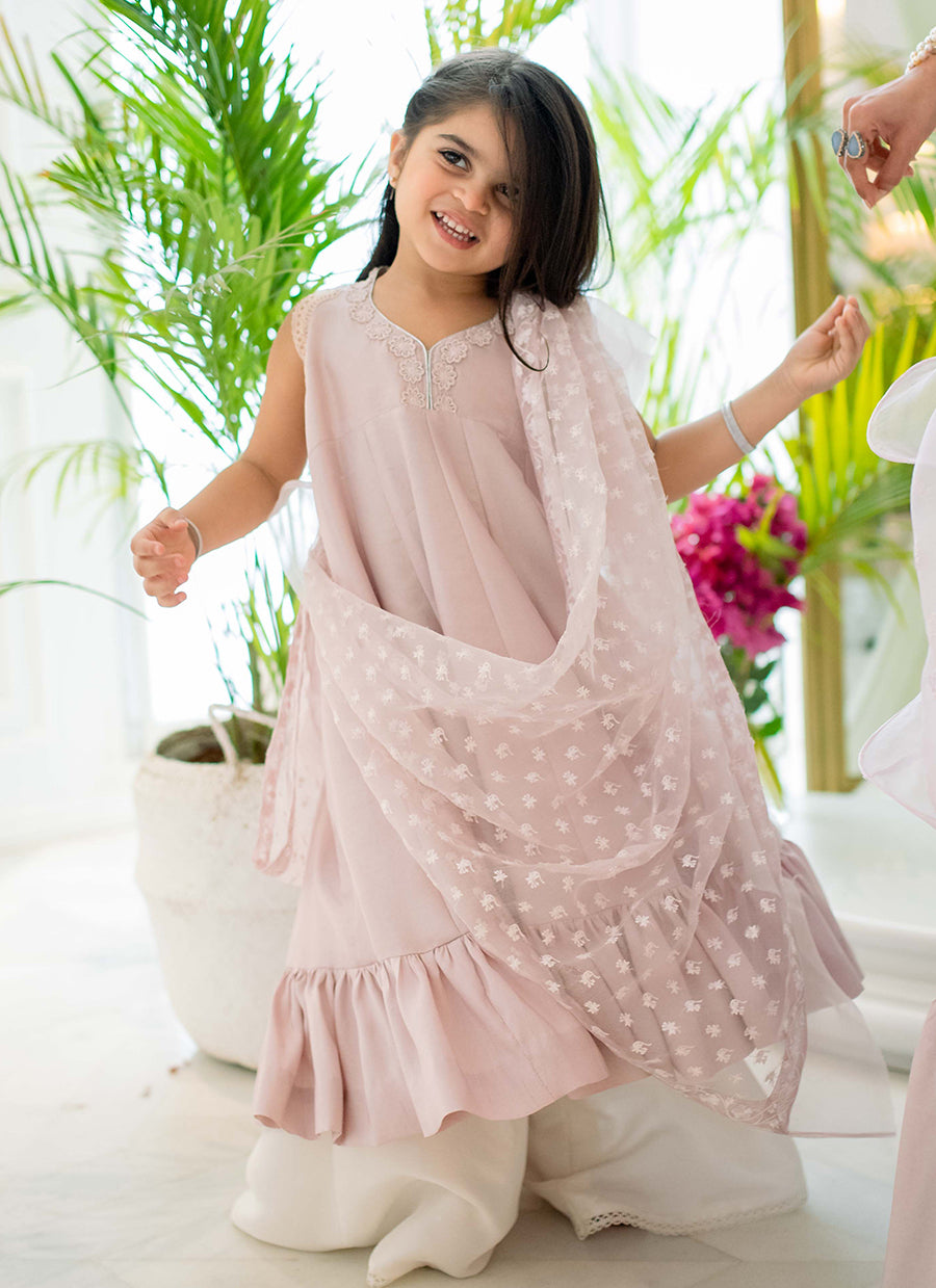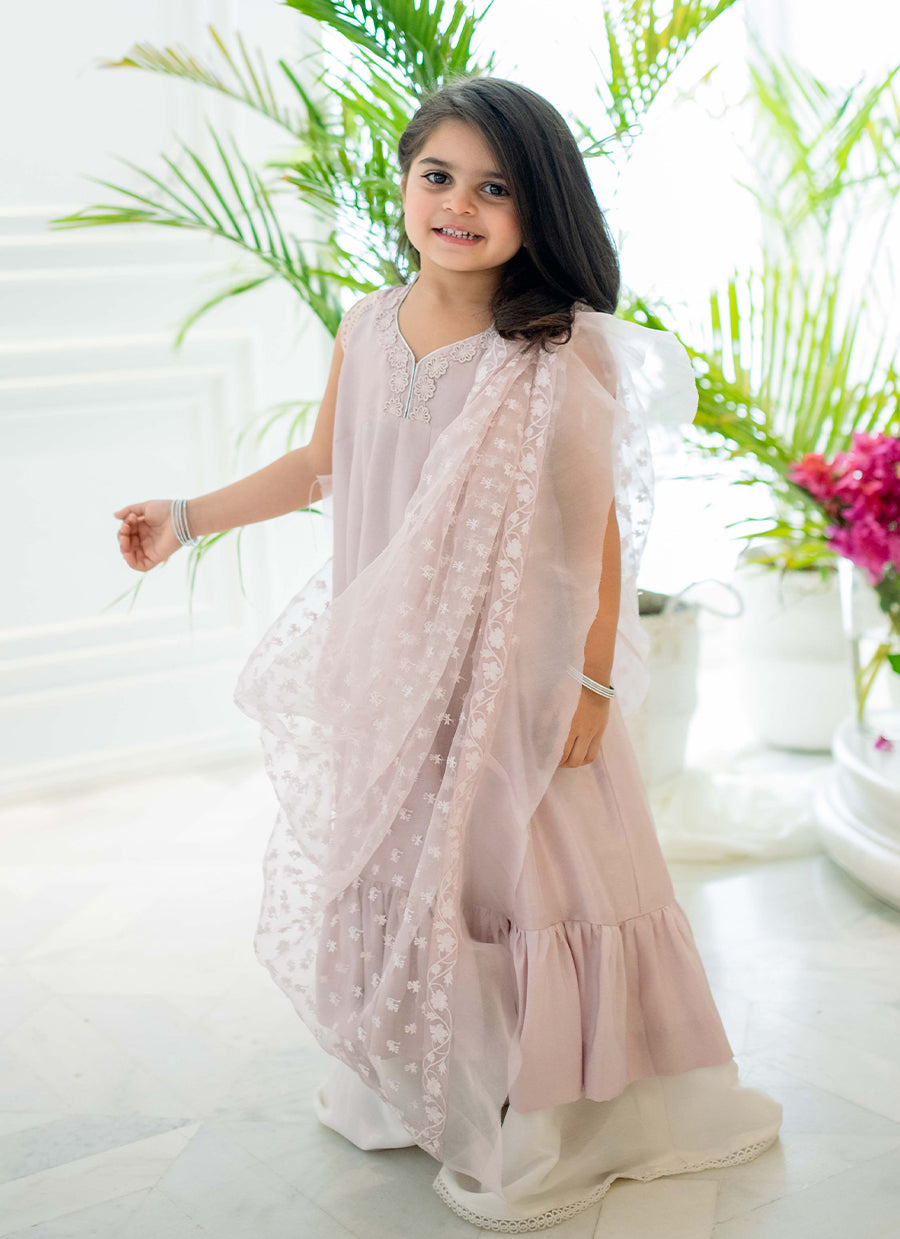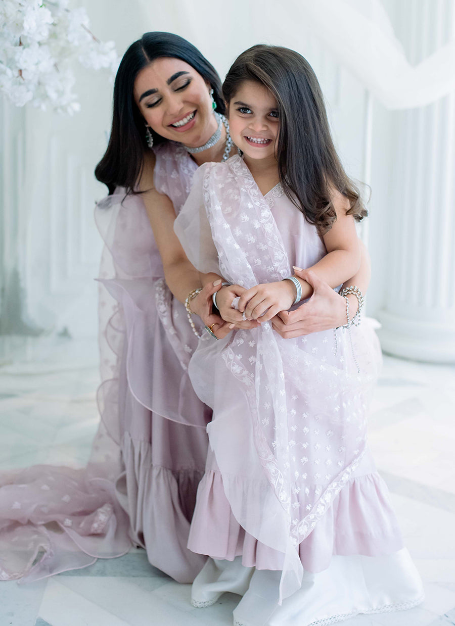 The perfect princess addition to your little girl's wardrobe! Dress your mini-me in the ultimate twirl worthy ensemble to make her feel on top of the world! A cute flowing kalidaar, in the dreamiest shade of lilac is cut from sumptuous raw silk, and adorned with silk thread work, hand embellished 3D florals, as well as, shimmering Swarovski crystals, sequins and pearls along the neckline. A beautifully pre-draped, organza dupatta trimmed with a soft, romantic frill is what makes this adorable ensemble a must have!