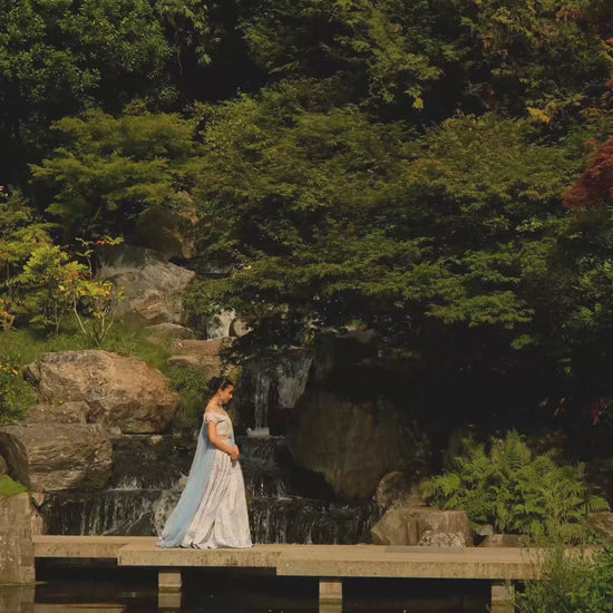 Drift into a dreamscape with Ivelle, a spellbinding lehenga choli in soft periwinkle where elegance meets enchantment. This romantic ensemble is adorned with delicate silver handwork that shimmers like stardust, tracing the curves of whimsical floral motifs that seem to bloom across the fabric with quiet poetry.Touches of lavender and soft pink add a painterly depth, evoking a twilight garden in full bloom. The meticulously crafted choli balances structure with softness, while the lehenga flows with a gentle grace, catching light and movement in every step.A sheer dupatta completes the look light as mist, edged with silver detailing that mirrors the intricate work of the lehenga, tying the whole piece together in ethereal harmony. Ivelle is not just an outfit, it’s a reverie woven in silk and silver. Perfect for the bride or muse who seeks elegance wrapped in fantasy, and who wants to embody grace with a hint of otherworldly charm.