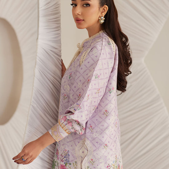 A canvas of soft lavender raw silk, is printed with delicate florals. The romantic, forever flattering silhouette has an elegant neckline, adorned with delicate hand-made floral motifs, pearls, sequins and unmissable organza detailing. The voluminous statement sleeves add to the magical, whimsical feel of the shirt.