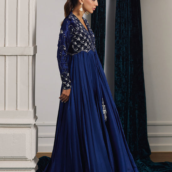 The Kismet Persian blue kalidaar with silver handwork is absolutely exquisite! The bodice cut from sumptuous velvet is adorned with intricate handwork. The richness of the velvet combined with the elegance of silver detailing creates a stunning, regal look.