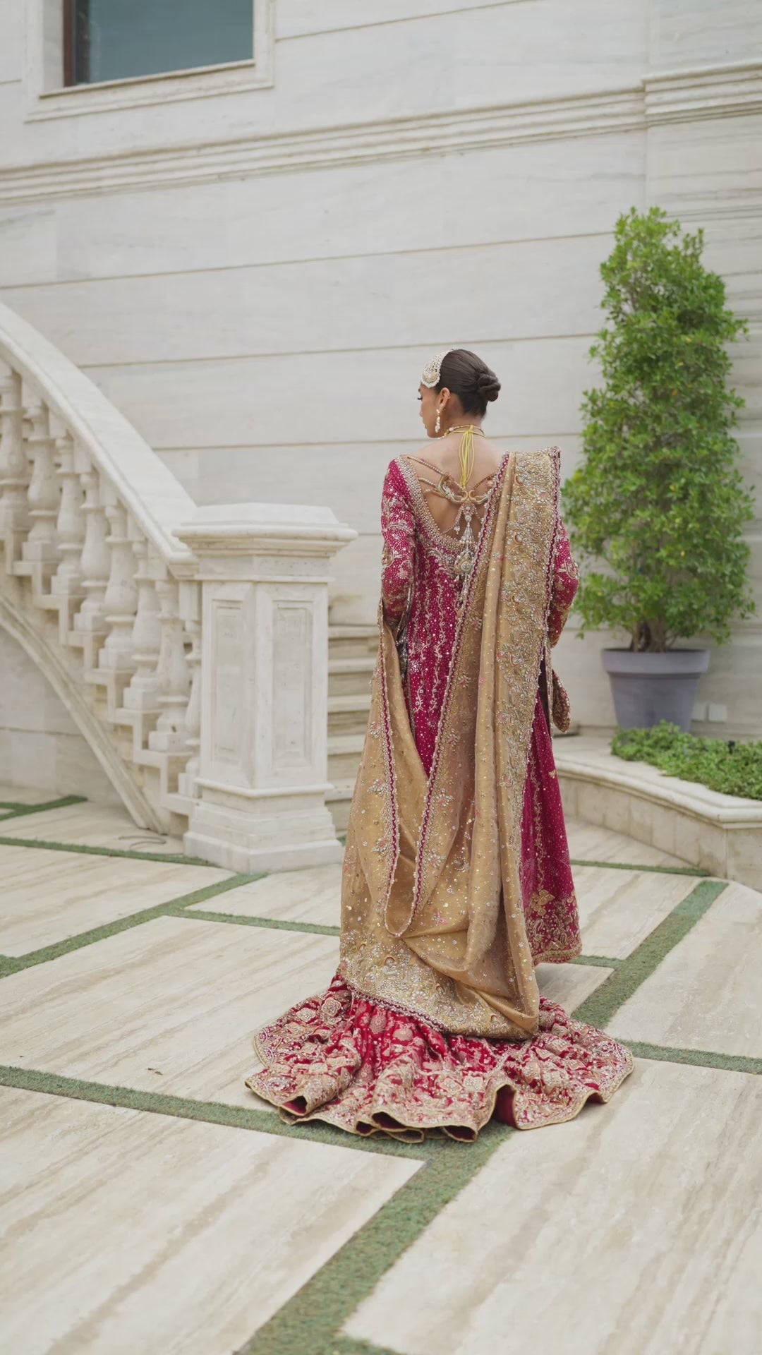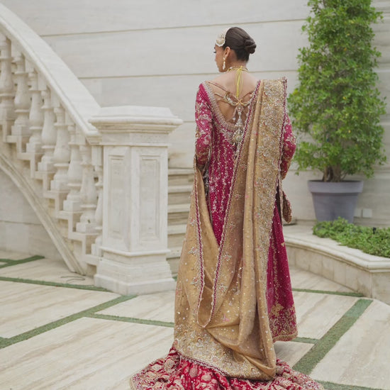 A timeless celebration of artistry, this crimson cotton net kalidaar shimmers with intricate handwork in kora, dabka, tilla, resham, mukaish, and crystals, woven together with luminous finesse. Contrasting tissue appliqués adorn the hem and side slits, adding depth and richness to the silhouette. Paired with a regal banarsi jamawar farshi lehnga, detailed with appliqués all around, the ensemble exudes a grand yet graceful presence. Completing the look is a golden tissue dupatta, framed with maroon appliqué borders, lending a striking contrast that enhances the ensemble’s royal charm.