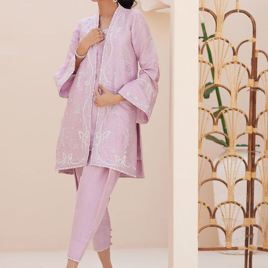 Your must-have essential for all festivities is finally here! A lilac jacket cut from pure raw silk features delicate silk thread work in ivory and pastel hues. Pearls, sequins and mini 3D flowers are hand embroidered to make you shine through all occasions. The jacket is layered over a pure raw silk slip with floral motifs and a gorgeous border on the neckline to make sure you get through those afternoon teas and late-night dinners with effortless ease. Style yours with our pure raw silk shalwar and clear high heels to complete your outfit.