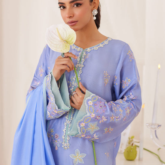 A refreshing shade of Periwinkle blue raw silk with delicate, pearl motifs all over is the ultimate must have for this spring. The relaxed, much loved silhouette has a universally flattering neckline, is gorgeously hand worked with pearls, sequins. The entire shirt is adorned with delicate embroidery is soothing pastel hues with gorgeous scalloped sleeves and hem, trimmed with organza. A pure medium silk dupatta with embroidered organza pallus completes your ensemble. Pair your outfit with our pure raw silk pant (as shown), and minimal earrings for a stunning look, no matter the occasion.