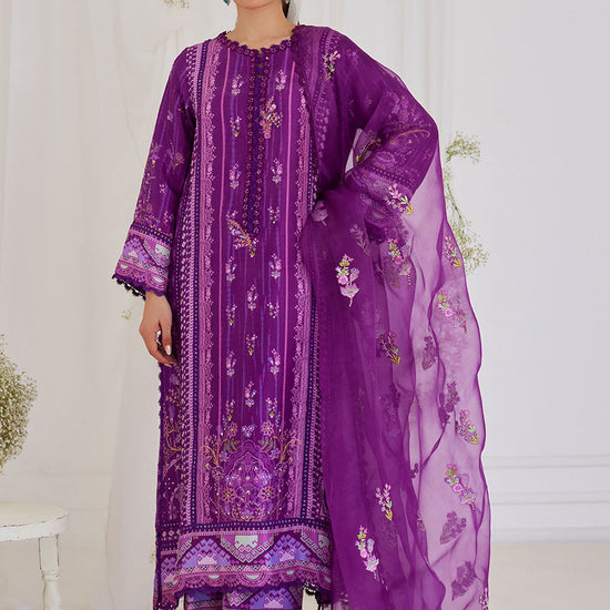 An organza dupatta is adorned with embroidered with delicate summer blooms and trimmed with a scalloped lace to bring the look together with easy elegance.