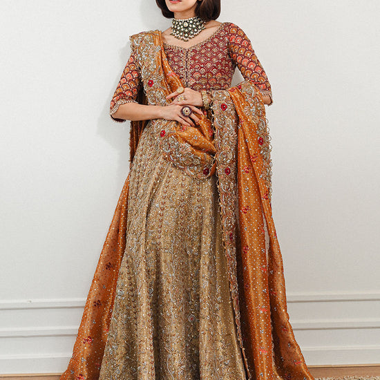 Embodying the fiery embrace of the sun at twilight, Lila evokes a captivating dance of color and texture. Deep red choli cascades in a symphony of curves, a dancer's dream realized. A contrasting golden lehenga, woven with shimmering threads, whispers tales of modern opulence. Lila's magic lies in the intricate dance of tradition and contemporary grace. Meticulous hand work adorns both bodice and skirt, each stitch a poem in shimmering thread. Here, heritage meets innovation, whispering stories on the breeze. This exquisite ensemble is a timeless fusion, perfect for etching a night in memory. Let crimson embrace your form and gold illuminate your path.