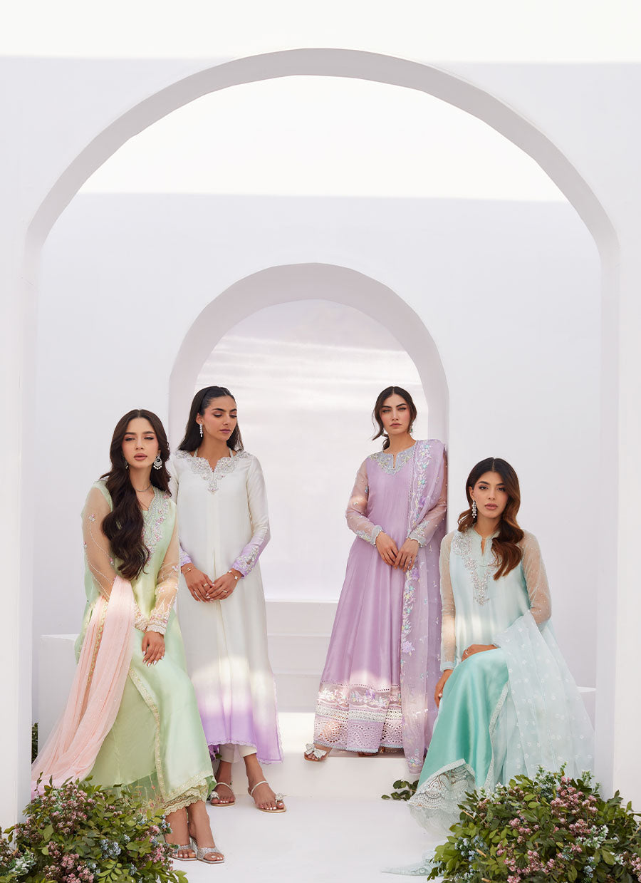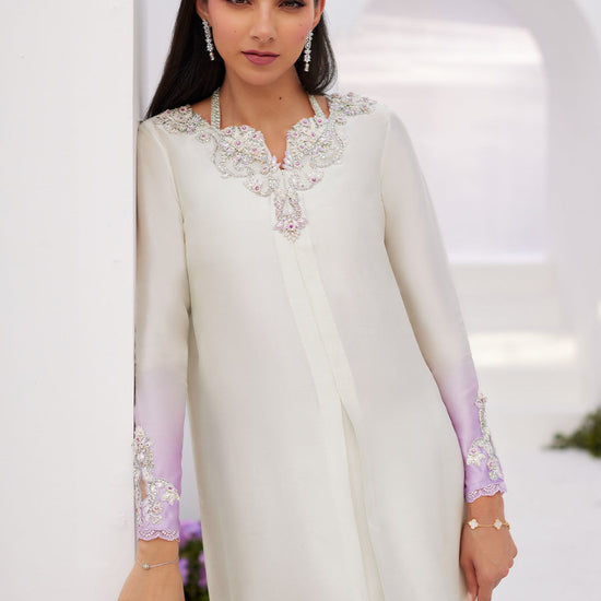 The neckline and sleeves have silver and pearl hand work to add a sparkly touch of elegance.