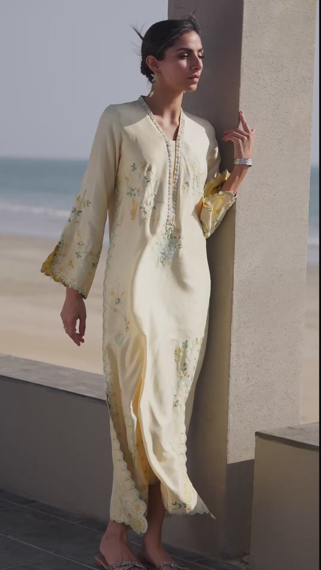 Bask in the glow of subtle sophistication with this softly radiant ensemble in the perfect lemon yellow. Crafted from luscious raw silk, the straight-cut long shirt with full sleeves and short side slits is adorned with intricate embroidery in a delicate pastel palette. Thoughtfully placed embroidery graces the neckline, sleeves, and hemline, while scattered motifs across the shirt lend a touch of balanced elegance.