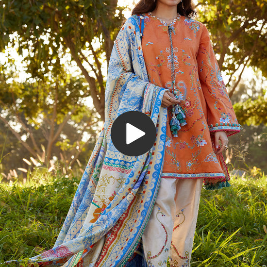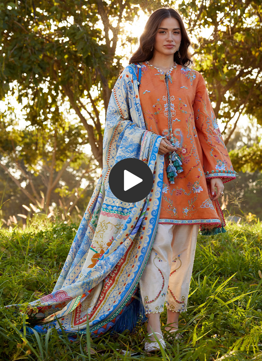 Inspired by the golden hues of an Italian summer, this unstitched lawn ensemble captures warmth, charm, and effortless sophistication. The vibrant orange lawn shirt is adorned with delicate multi-tone embroidery in shades of aqua, blush, and soft ivory — reminiscent of coastal tiles and hand-painted Mediterranean motifs. Intricate detailing across the neckline, sleeves, and hem adds depth while keeping the silhouette light and breathable. The look is elevated with a contrasting printed dupatta in refreshing turquoise and blue accents, framed with statement borders and playful tassel detailing echoing the romance of seaside towns and sunlit courtyards. A perfect balance of bold color and refined craftsmanship made for summer festivities, brunches, and destination evenings.