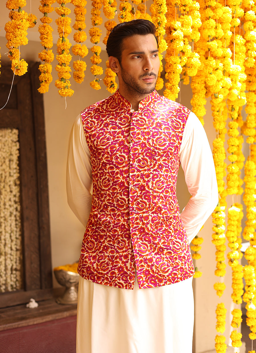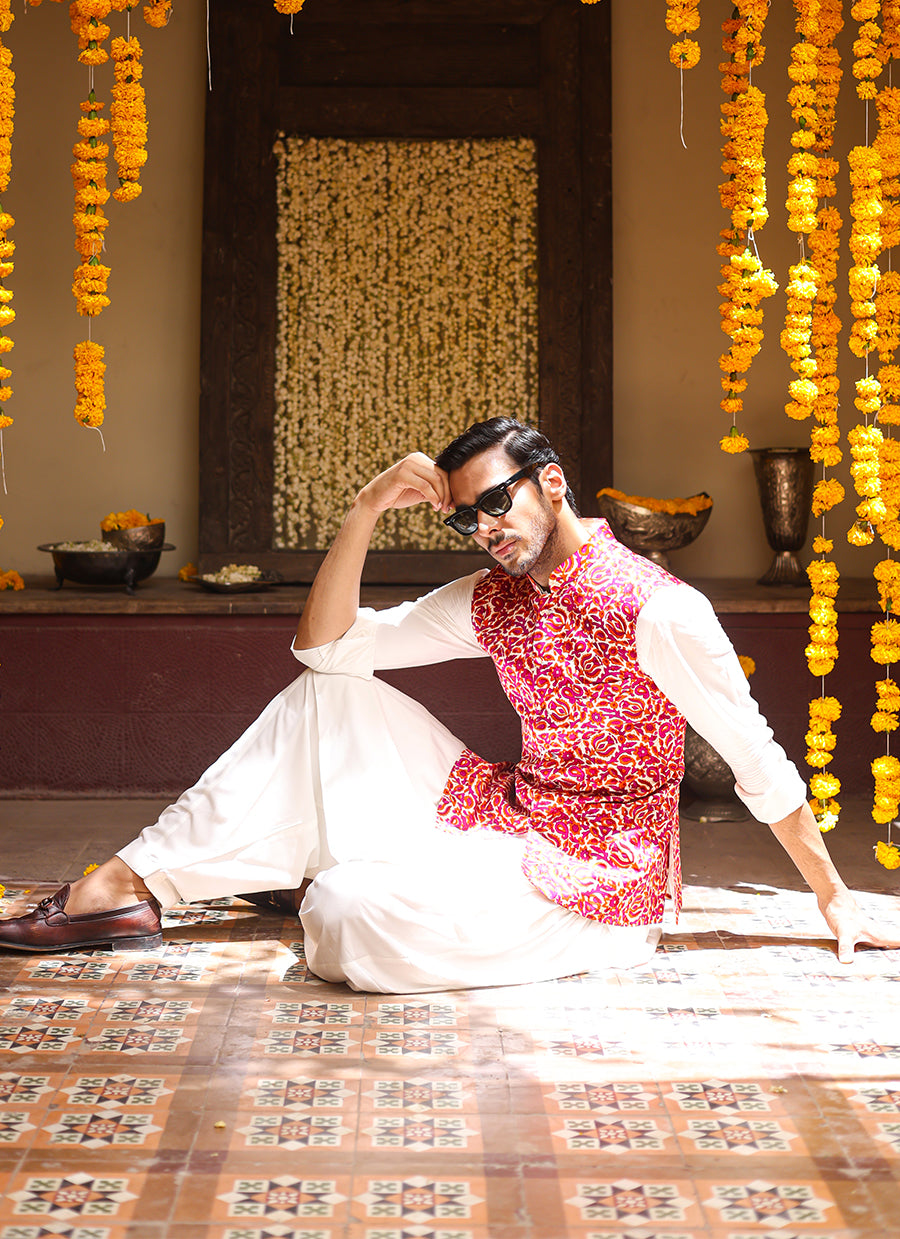 Farah Talib Aziz’s foray into menswear results in a sleek, pared down approach to the traditional festive ensemble for men, a striking hand blocked waistcoat in vibrant shades of pink and orange. The intricate hand blocking technique brings out the rich, ivory colors and creates a visually captivating pattern that serves as the focal point of the outfit. This combination of the brightly colored hand blocked waistcoat with the understated yet luxurious ivory kurta creates a perfect blend of traditional craftsmanship and contemporary style. Ideal for festive occasions and special events, this outfit ensures that the wearer exudes confidence and charm.