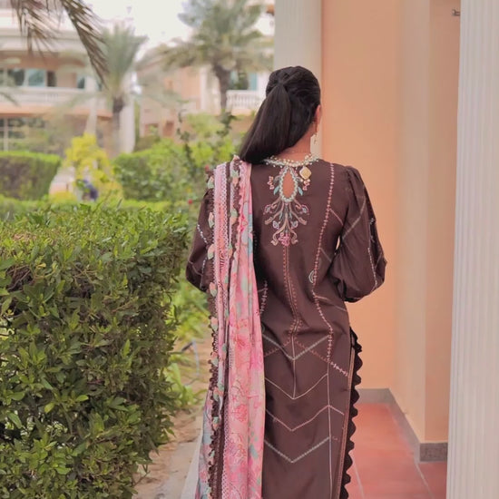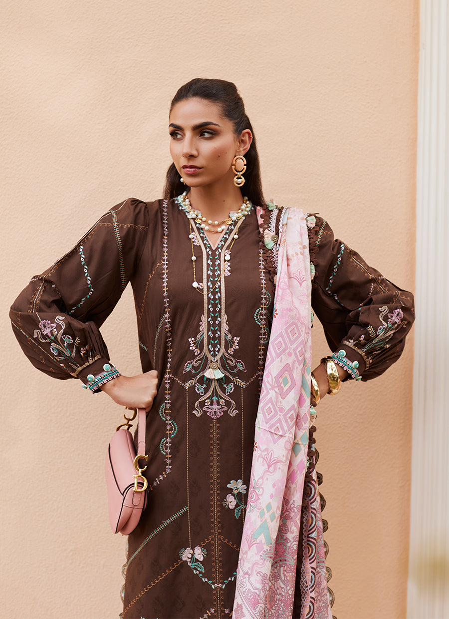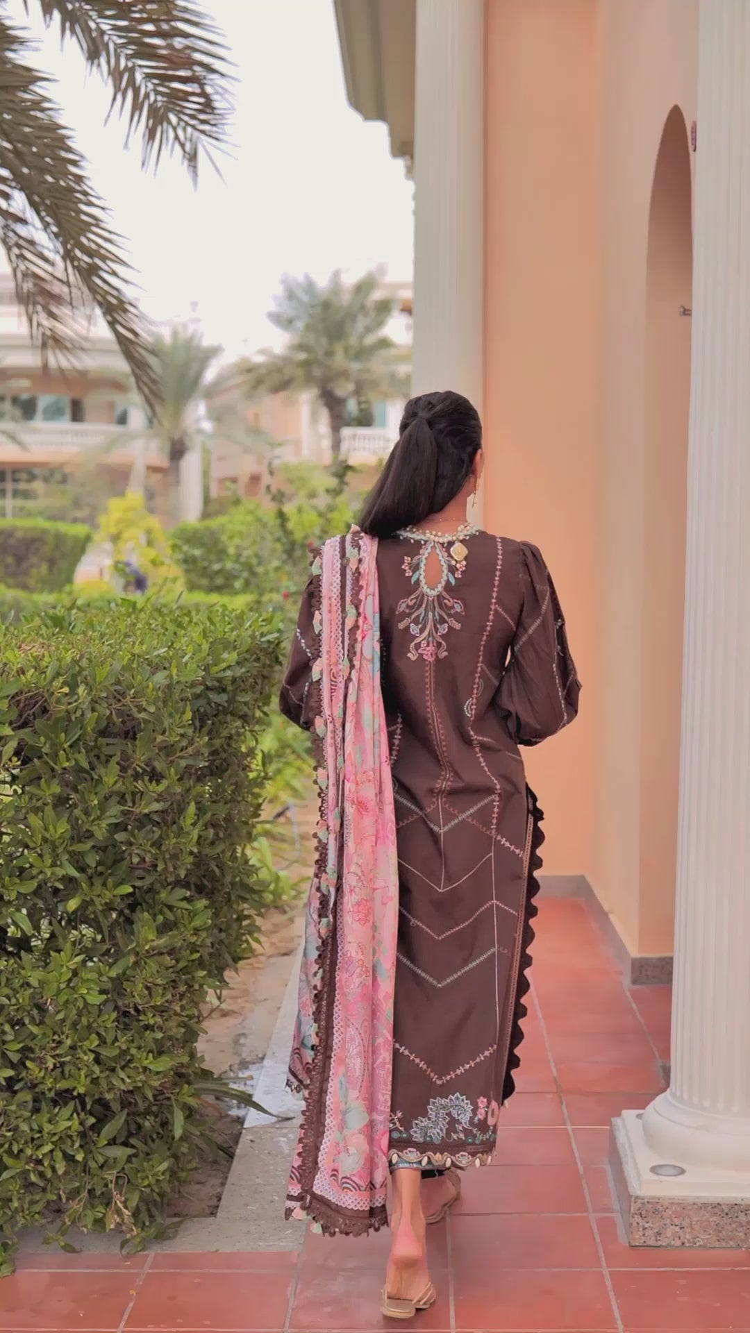 Introducing for the first time our most loved shade of the year, a rich chocolate hue. The luscious botanical and chevron inspired embroidery in pink, lavender and fresh green shades. The stunning pure medium silk dupatta in summery hues completes the ensemble with magical flair. The comfortable, jacquard pants will keep you comfortable day or night. Breeze through summer in an irresistible design that do more for your look, than ever before!