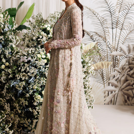 Cut in pure net in a soft shade of ivory our kalidaar jacket is what dreams are made of. The Jacket itself features the most ethereal 3-D floral hand work that's further accentuated with Swarovski crystals, sequins, pearls, zardozi and hand-made organza petals. The embellishments forma trellis that features florals in a myriad of lavender, pink and mint shades featuring ombre techniques that make this outfit a true piece of art. The outfit adorned in with silver zardozi, resham work with pearl sequins and crystal details sings in symphony with our celebrated multi layered net skirt featuring dramatic ruffles and floral springs on the border. The bodice features a geometric appliqués of soft pastel shades with hand embellishments that boast immaculate attention to details. A particularly loved feature of this outfit is its handmade tassels that flow down the back and sides.