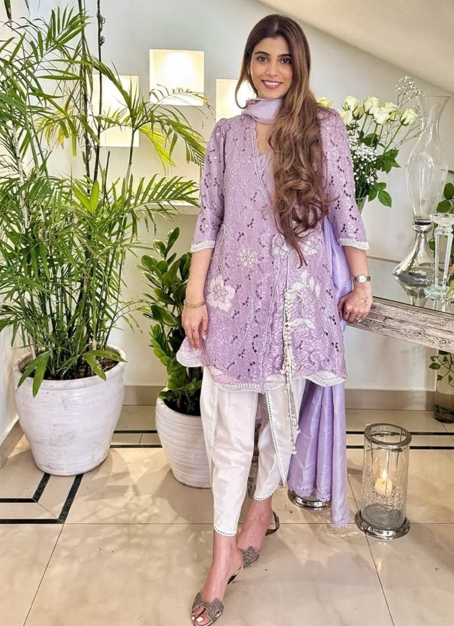 This lavender short wrap in schiffli raw silk is a stunning fusion of modern design and intricate craftsmanship. The shirt features a contemporary layout with curvilinear lines, beautifully adorned with large floral appliqués and 3D hand embellishments that create a striking visual impact. The statement tassel drop adds an element of playfulness, while the modern silhouette enhances the festive vibe of the entire ensemble. Paired with a pure crepe overlapping tulip shalwar, the outfit offers a perfect blend of elegance and contemporary flair, making it a captivating choice for any special occasion.