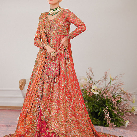 Celebrate the momentous occasion with "Maisha," a bridal ensemble that embodies refined elegance with a touch of modern flair. This captivating outfit features a long, front-open kalidaar shirt in a stunning coral shade, its silhouette exuding timeless beauty. Panels made of pure gold zari that are meticulously adorned with kamdani and kora embroidery, shimmer across the bodice, whispering stories of heritage. Each stitch is a testament to generations of artistry.