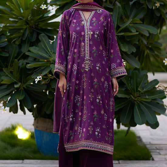Cut from sumptuous velvet, the shirt with a canvas of rich plum is adorned with a delicate floral print.
