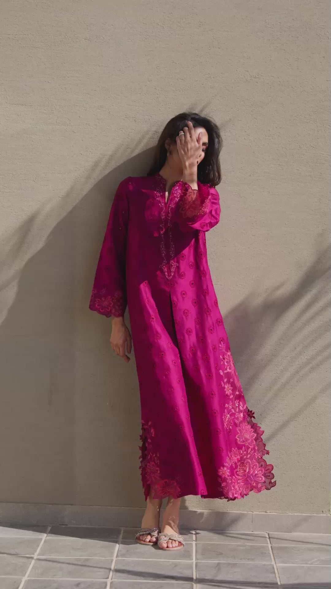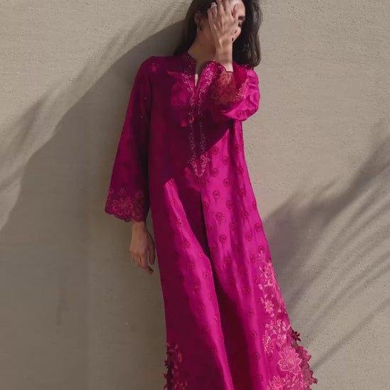 Cut from pure, breezy raw silk, this loose-fit A-line shirt is destined to become a wardrobe favorite. A vibrant magenta hue is brought to life with intricate silk-thread schiffli trellis embroidery, while the universally flattering neckline and sleeves are adorned with lustrous Swarovski crystals, pearls, and sequins, adding a subtle shimmer. The corners of the shirt are decorated with stunning embroidered cutwork. Flowing gracefully, this shirt is the perfect blend of effortless sophistication and playful elegance.