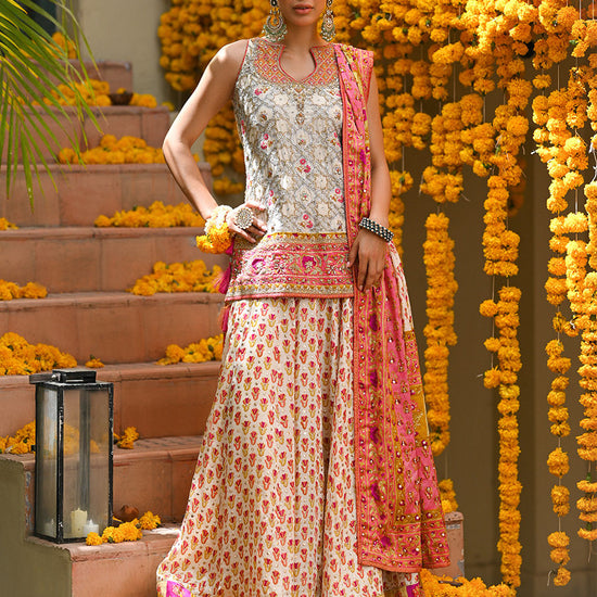 One of the most stunning outfits this season, you can’t stop admiring it! A hand blocked ivory lengha and short shirt adorned with vibrant shades of pinks, orange, corals and yellow. The short shirt is richly embellished with sitara, zardozi, kora, and dabka work, showcasing intricate craftsmanship and adding a luxurious touch to the outfit. The lengha, in matching ivory, ties the look together with its elegant and complementary design. It is paired with a pink and orange hand blocked dupatta, which is further enhanced with detailed handwork all over, adding depth and a splash of color to the ensemble. This outfit is perfect for festive occasions and celebrations, where the blend of traditional embellishments and vibrant hues creates a lovely and elegant look. The combination of intricate detailing and bold colors ensures that the wearer stands out with grace and sophistication.