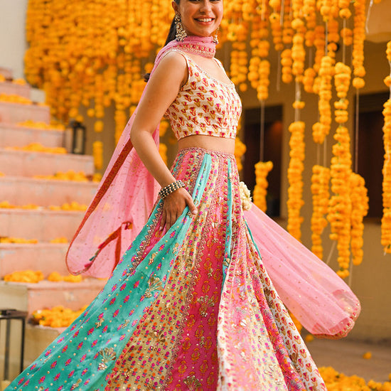 The most fun outfit that will never got out of style! A meticulously crafted hand blocked lehenga choli adorned with intricate handwork. The embellishments include gota, kora, dabka, and detailed thread work, creating a rich and textured appearance that exudes elegance and sophistication. Paired with the lehenga choli is a pink net dupatta, embellished with sitara chann all over, adding a subtle shimmer that enhances the outfit's ethereal beauty. The dupatta is finished with vibrant tassels, adding a playful and festive touch that complements the intricate handwork of the lehenga choli. This outfit is perfect for special occasions and festive events, where the combination of traditional craftsmanship and contemporary design elements creates a stunning and memorable look. The intricate detailing and vibrant accents ensure that the wearer stands out with grace and sophistication.