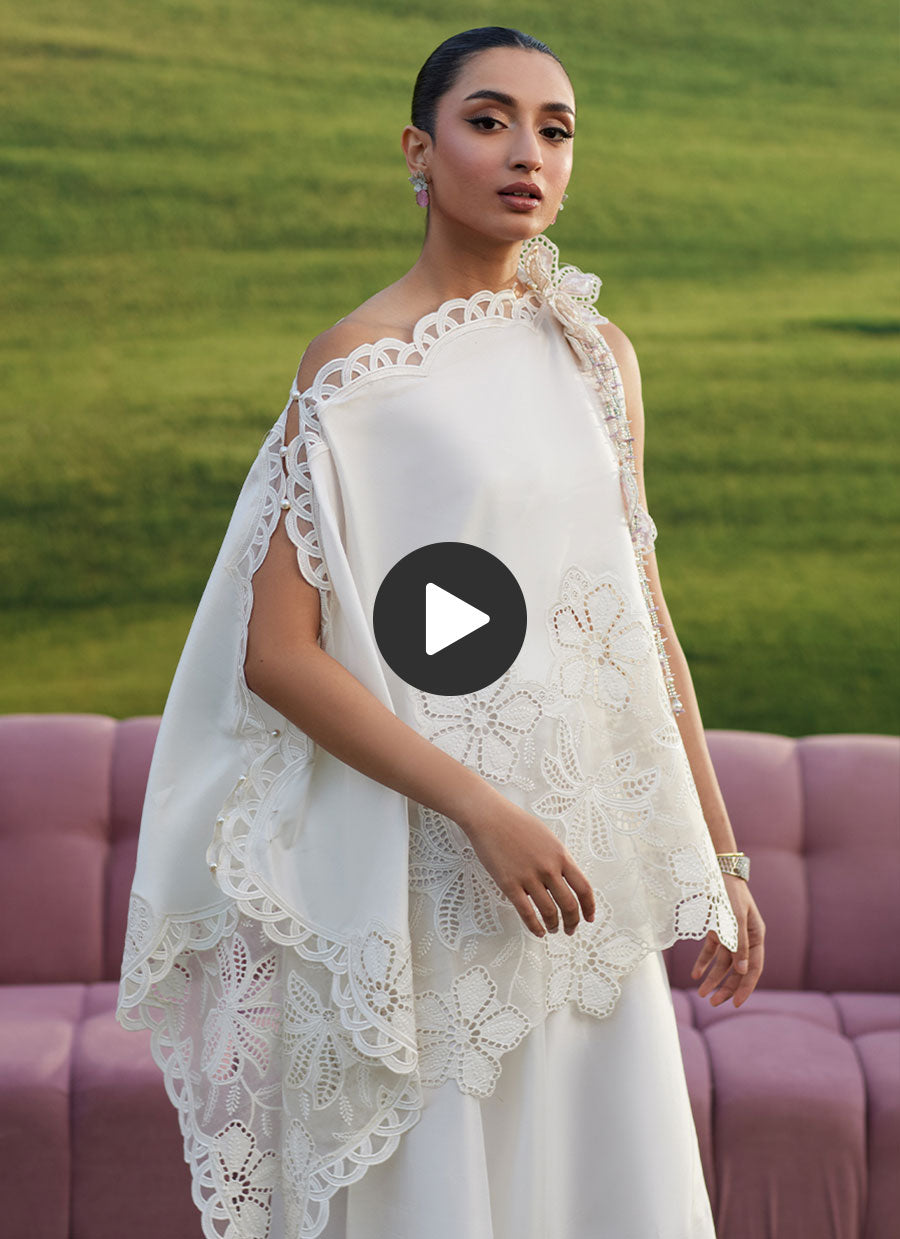 Minimal, luxe, and straight out of a fashion girl’s moodboard — Marlene is your ultimate modern festive layer. This ivory-toned statement jacket features bold schiffli-inspired cutwork detailing, giving it that clean, high-end, couture feel while still staying light and wearable. Paired with wide-leg raw silk pants, Marlene is perfect for Eid mornings, chic dinners, and those days when you want to serve elegance with a cool-girl edge.