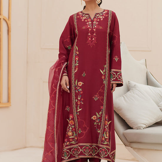 With so many intricate details, you’ll always have something to admire in the Marsala ensemble. Cut from pure crimson raw silk, the relaxed fit, universally flattering kurta is a must have for this season. Lavishly adorned with delicate floral embroidery all over the shirt and rich borders on the hem and sleeves in warm, autumnal hues. A stunning, diaphanous organza dupatta with embroidered borders, completes the ensemble with graceful flair.