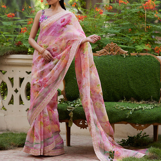 This timeless silhouette is given a contemporary twist as it is digitally printed with fresh florals, blooming delicately all over. Cut from floaty organza that’ll have you feeling like a fairy and trimmed with a delicately embroidered border, the simplicity of this saree speaks volumes. Paired with a stunning blouse, cut from pure raw silk, adorned with gorgeous sequined blooms, this is just an absolute must have.