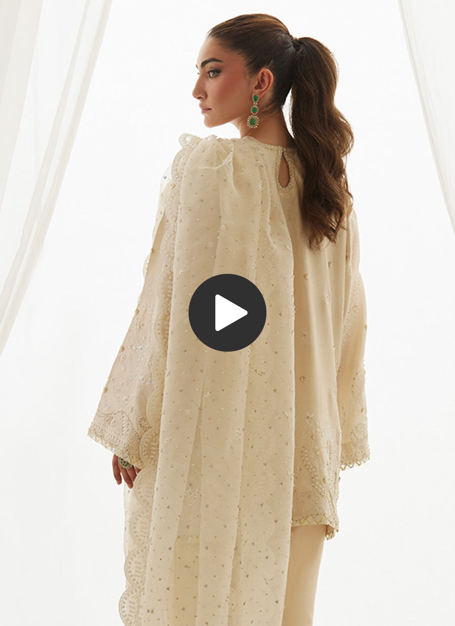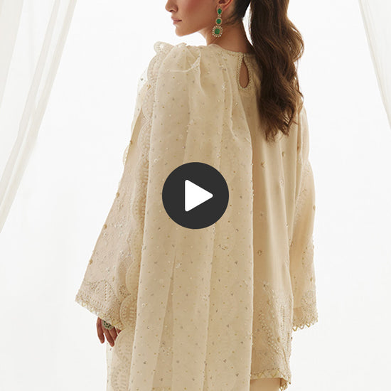 Refined yet striking — an ivory raw silk shirt, intricately embroidered and hand-embellished, pairs with a tailored shalwar accented by delicate embroidery. A pure medium silk dupatta, scattered with subtly shimmering sequins, completes the look with quiet glamour.
