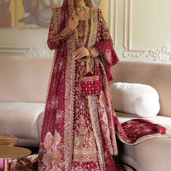 A painstakingly chosen shade of the richest scarlett. The pure cotton net shirt with full sleeves is adorned with exquisite hand embroidery. Traditional embellishments such as intricate kora, dabka, naqshi and kaamdaani. Rust and coral appliqued borders decorate the daaman.