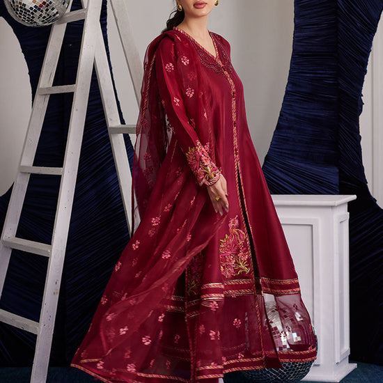 The red raw silk kalidar is a striking choice, with its rich, luxurious fabric that exudes elegance and sophistication. Raw silk has a unique texture, giving the garment a refined yet understated appeal. The intricate handwork on the neckline adds an artisanal touch, elevating the outfit with delicate, personalized detailing. This kind of craftsmanship often involves fine thread work, beads, or sequins, which can create a beautiful contrast against the deep red hue of the fabric. Complementing the kalidar is an embroidered organza dupatta, which introduces an element of lightness and flow to the ensemble. The fine, sheer organza fabric, adorned with exquisite embroidery, creates a delicate yet striking effect, balancing the richness of the raw silk. Together, these elements combine to form a sophisticated, well-crafted outfit ideal for any festive or formal occasion, where elegance and tradition meet modern design.