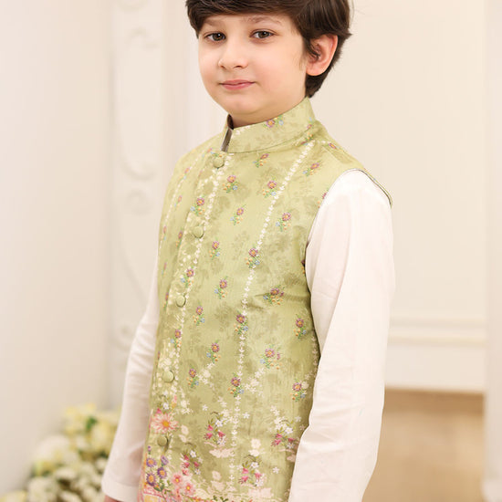 This light green and pale pink floral raw silk waistcoat for young boys is a delightful blend of softness and sophistication. The delicate floral pattern, in shades of pale pink, ivory and soft green, creates a refreshing, nature-inspired look, perfect for spring or summer occasions. Tailored to perfection, the waistcoat features a sleek, modern cut with fine button fastenings and carefully crafted edges, ensuring a polished finish. Ideal for pairing with a white kurta shalwar, this waistcoat adds a touch of refined charm and youthful elegance to any young boy's wardrobe.
